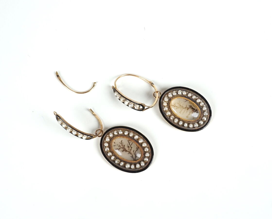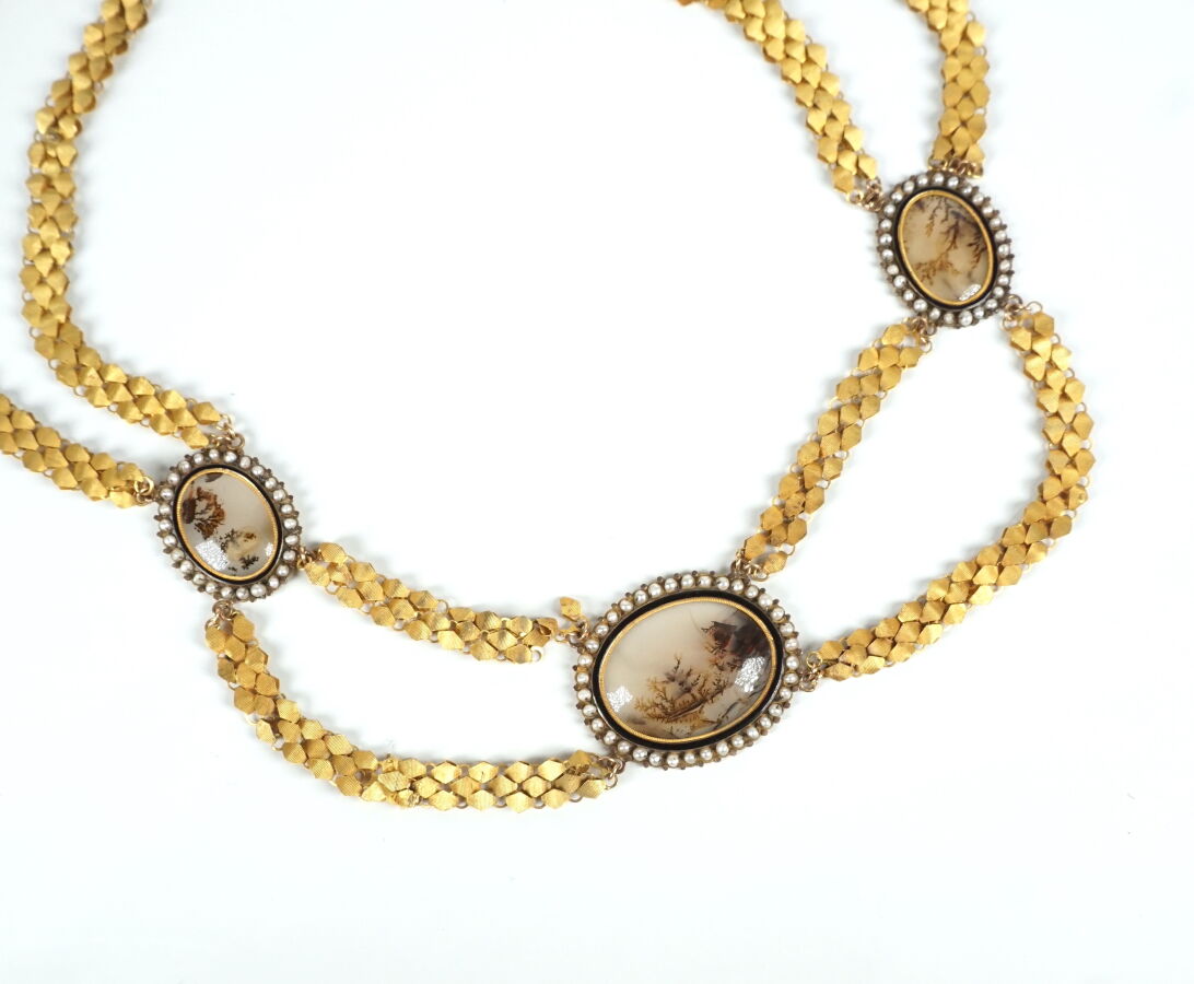 Parure en or jaune 18K (750/oo), poinçon tête de coq bec fermé à droite (1798-1809), et argent (800/oo), agrémentés de médaillons sertis d'agate arborisée, soulignée d'une ligne émaillée noire, dans un entourage de petites perles probablement fines, comprenant :