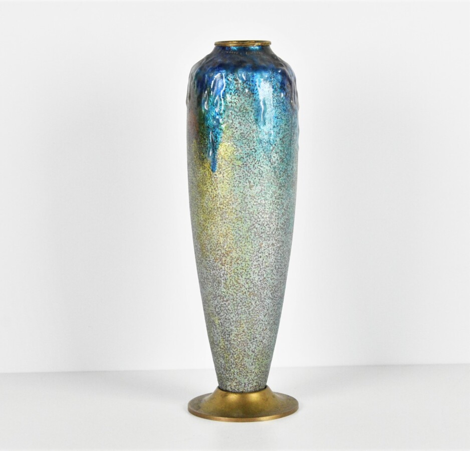 Paul BONNAUD (1873-1953) - LIMOGES : Vase ovoïde à col resserré en émaux bleutés sur cuivre reposant sur une base circulaire, signé à l'or à la base du col, circa 1930, H. 22.5 cm (2 bulles et craquelures dans les coulures en partie haute).