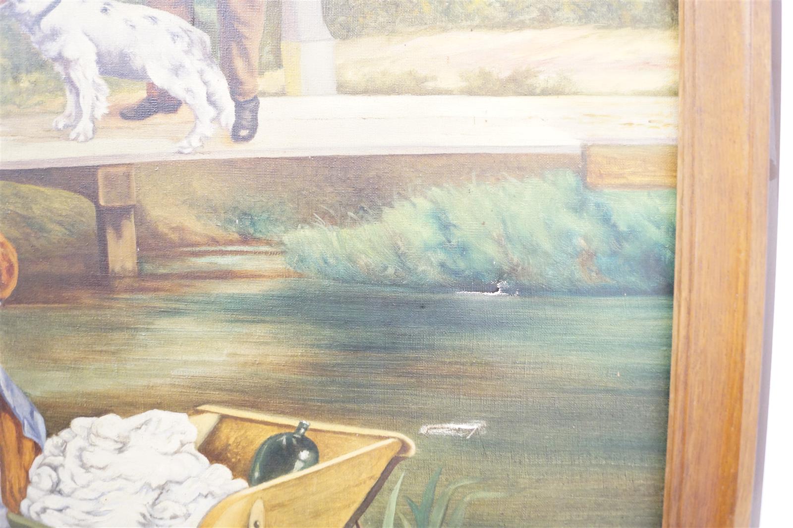 Paul CONRATH (XXe), "Les chasseurs et la lavandière", huile sur toile signée en bas à droite, 63 x 98 cm (accidents).