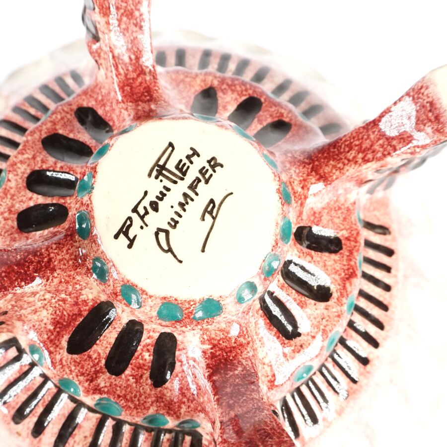 Paul FOUILLEN (1899-1954) - QUIMPER : service à crème en faïence polychrome à décor d'un fleuron d'algues, le bord dentelé, signé sous la base, comprenant 1 coupe quadripode et 10 coupelles, dim. coupe : 13 x 25.5 cm, dim. coupelle : 4.5 x 14.5 cm (légers éclats).