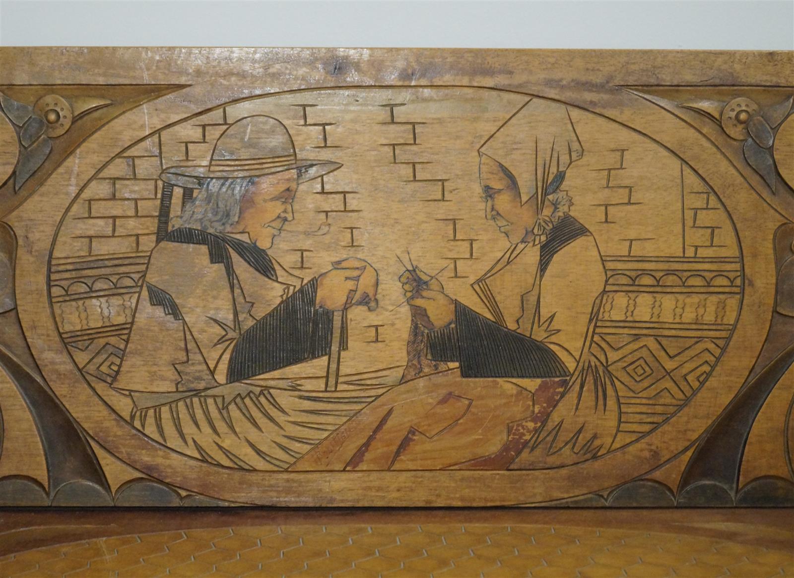 Paul FOUILLEN (1899-1958) : Petit banc en bois de noyer, sculpté à décor de personnages et de motifs celtiques, signé, 110 x 35 x H. 80 cm (complet de ses clavettes, quelques petits chocs et rayures d'usage, de petites fentes notamment sur un accotoir, un bout d'accotoir cassé et recollé à l'arrière, quelques trous de vers en partie basse)