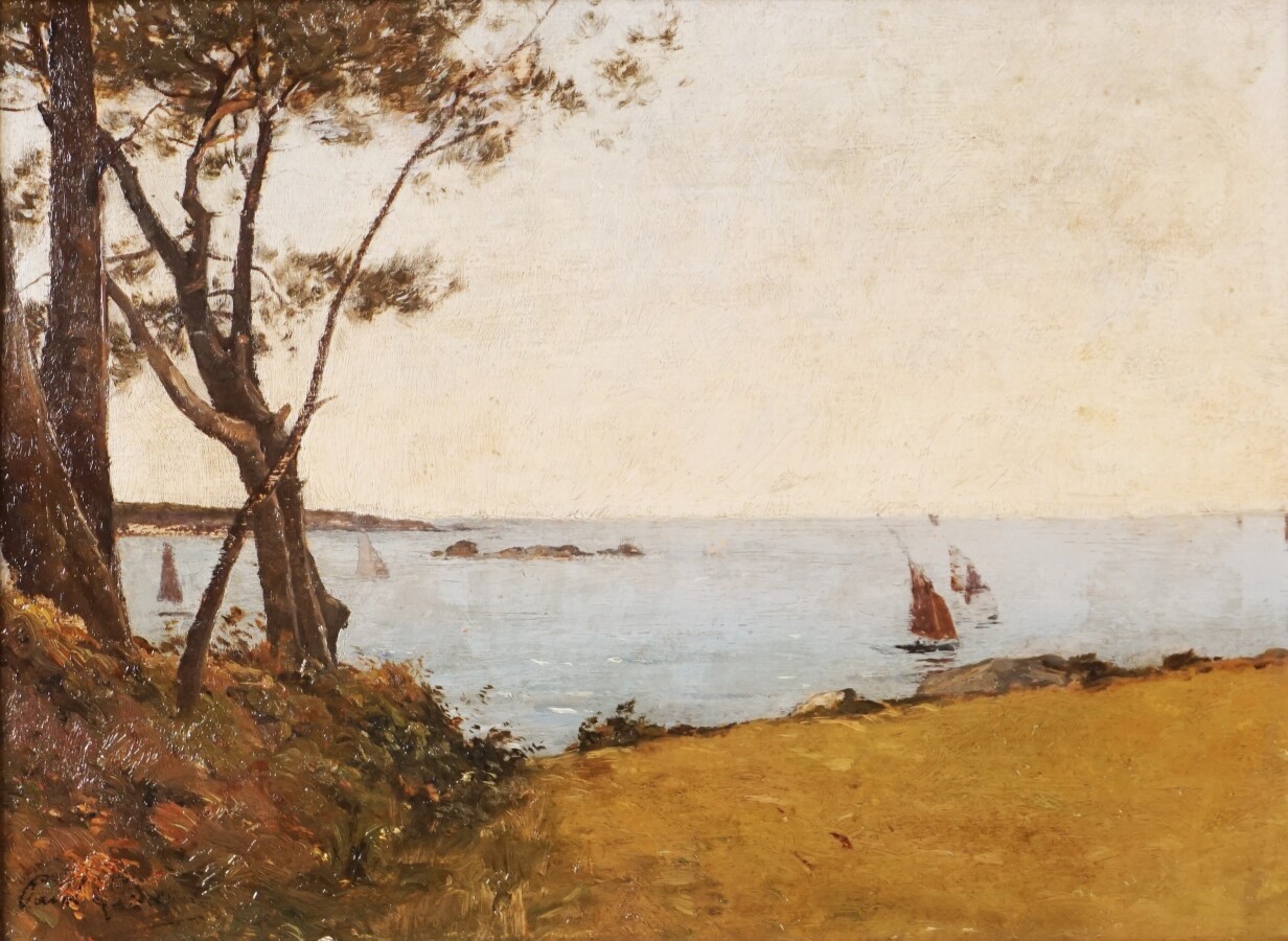 Paul LECOMTE (1842-1920), "Voilier, bord de mer", huile sur panneau signée en bas à gauche, 26 x 34.2 cm.