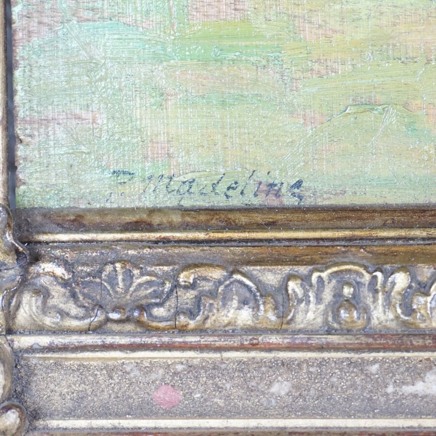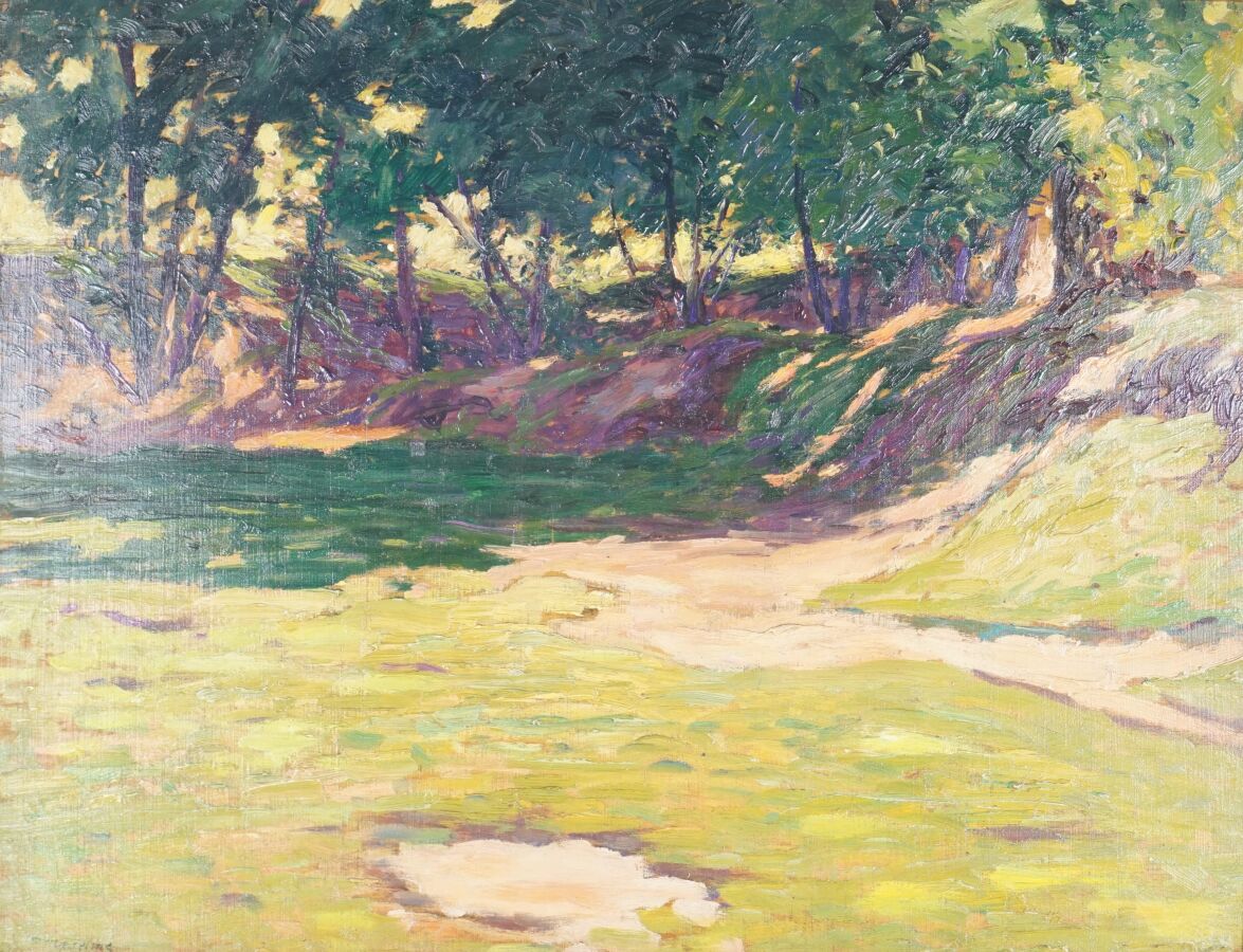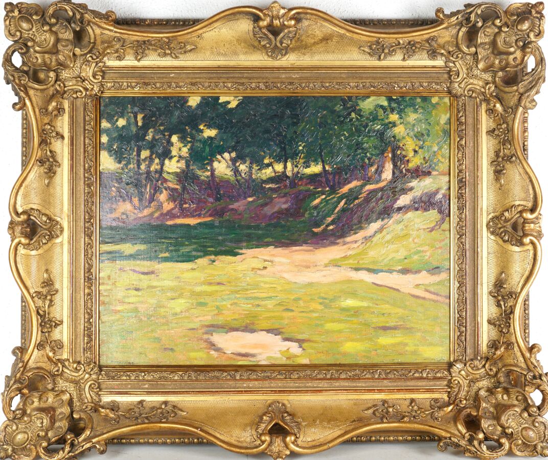 Paul MADELINE (1863-1920), "Clairière en Ile-de-France", huile sur panneau signée en bas à gauche, située au dos, porte le cachet "Atelier Paul Madeline, 3ème vente à Versailles le 5 novembre 1978", 37.5 x 46 cm (accidents au cadre).