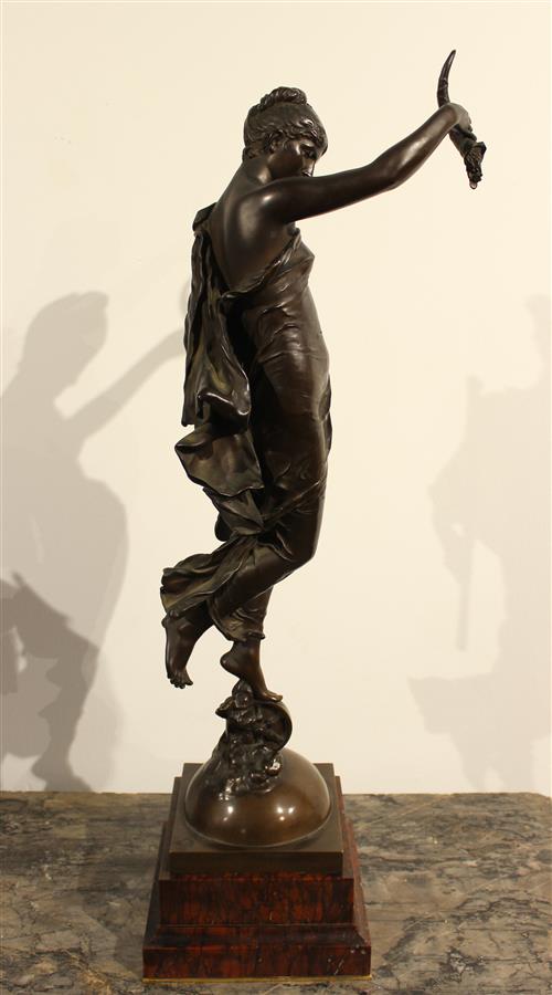 Paul MOREAU-VAUTHIER (1871-1936), "L'allégorie de la fortune", bronze à patine brune représentant une femme sur une roue tenant un gouvernail et une corne d'abondance, signé "F. Barbedienne Fondeur" sur la terrasse, présente un cachet "Réduction mécanique A. Collas", socle en marbre rouge veiné, H. 80.5 cm (manque le cartouche sur le marbre)