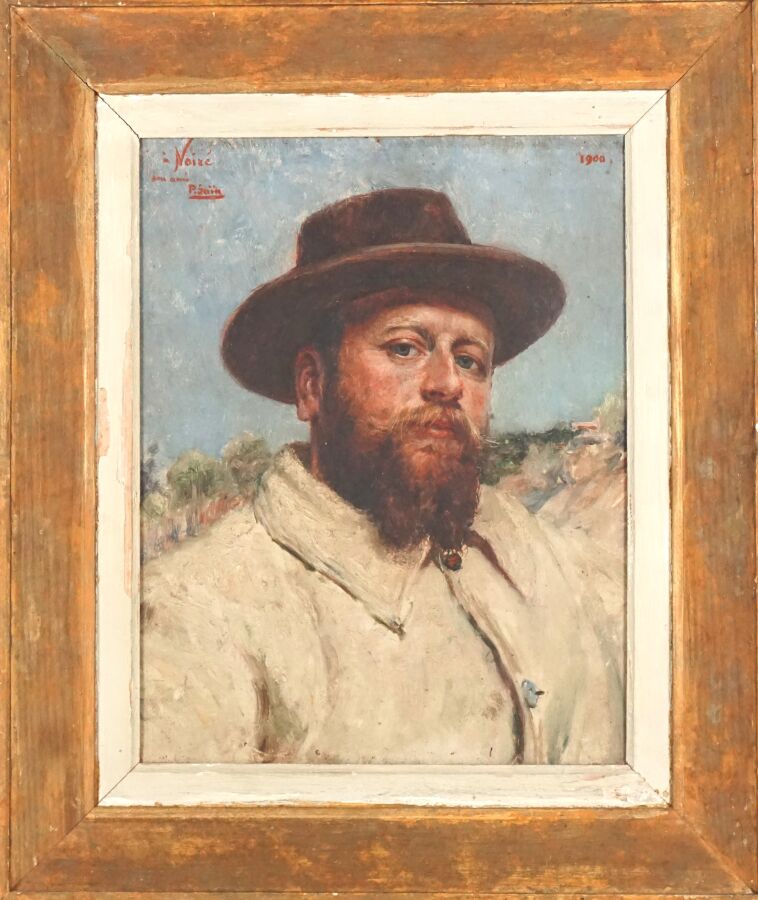 Paul SAIN (1853-1908), "Portrait présumé de l'artiste Maxime Noiré" 1900, huile sur toile signée en haut à gauche avec un envoi, datée en haut à droite, 35 x 27.5 cm (petite restauration).