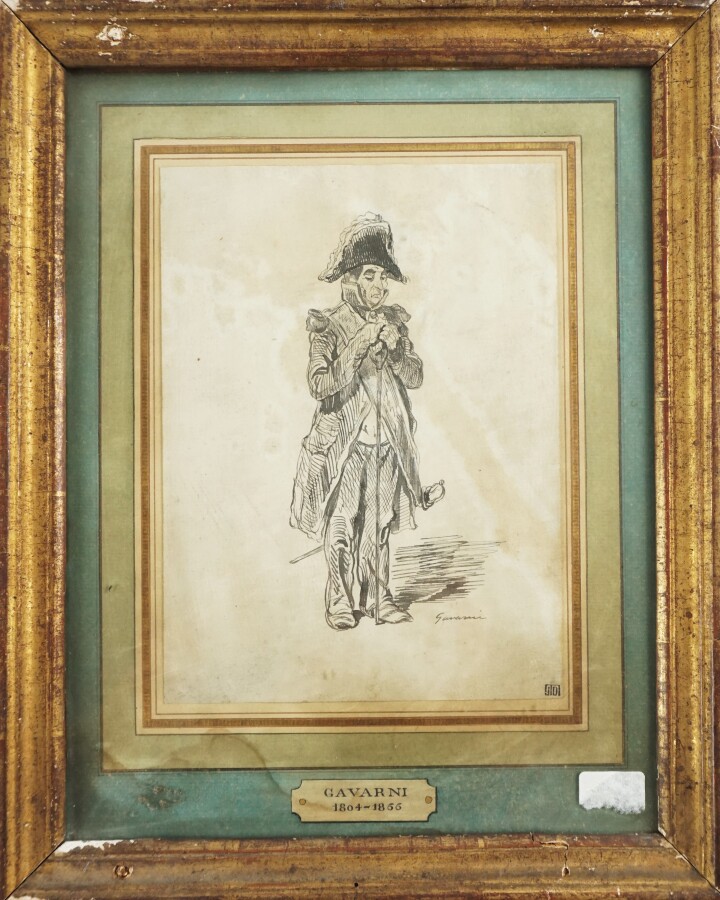Paul-Sulpice GAVARNI (1804-1866), "Gendarme", plume et encre de chine sur papier, signée "Gavarni" en bas à droite, 18 x 13 cm (insolé).