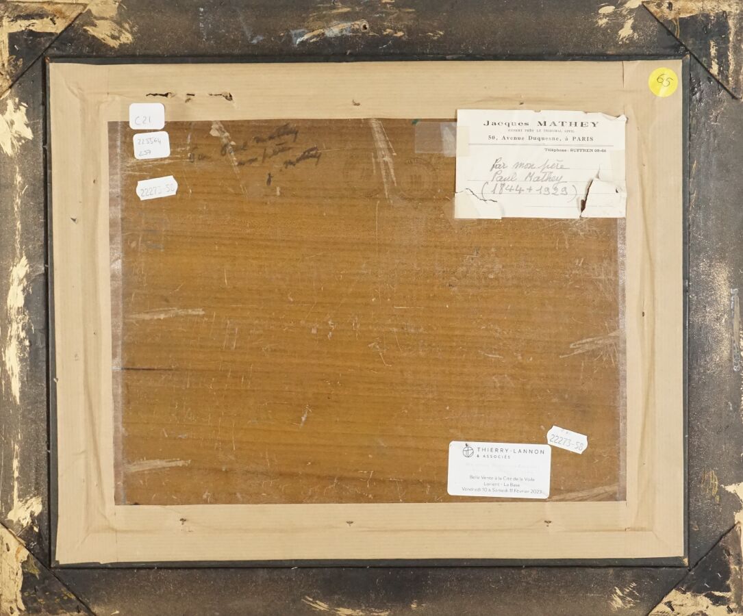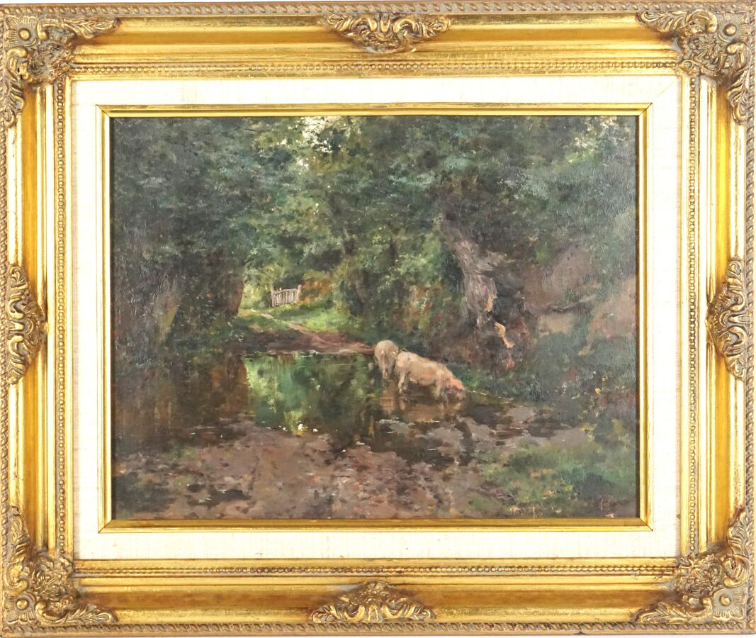 Paul Victor MATHEY (1844 - 1929), "Cochons dans le sous-bois", huile sur panneau, trace de signature en bas à droite, contresignée au dos, Dim. 27 x 33,5 cm.
