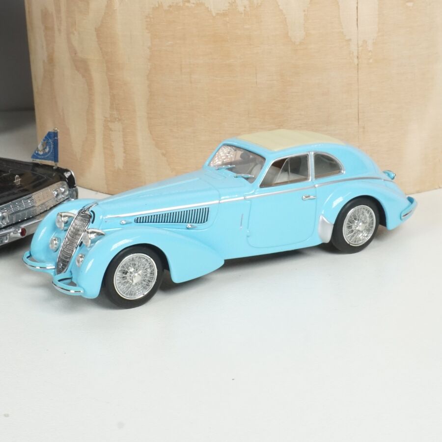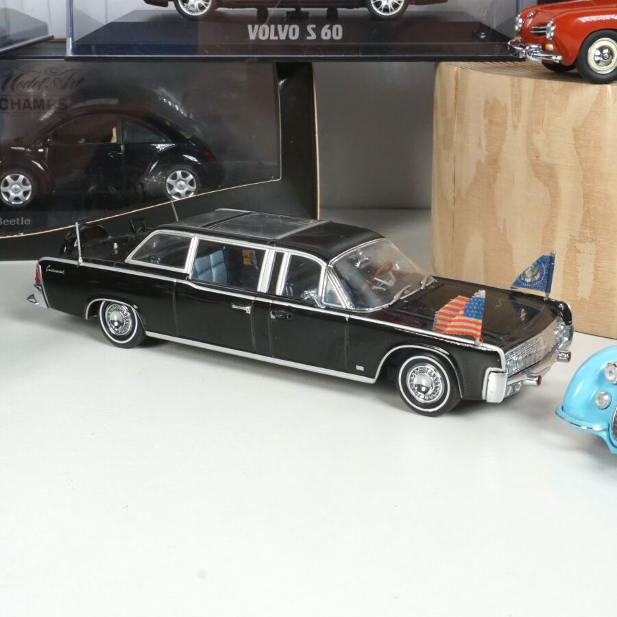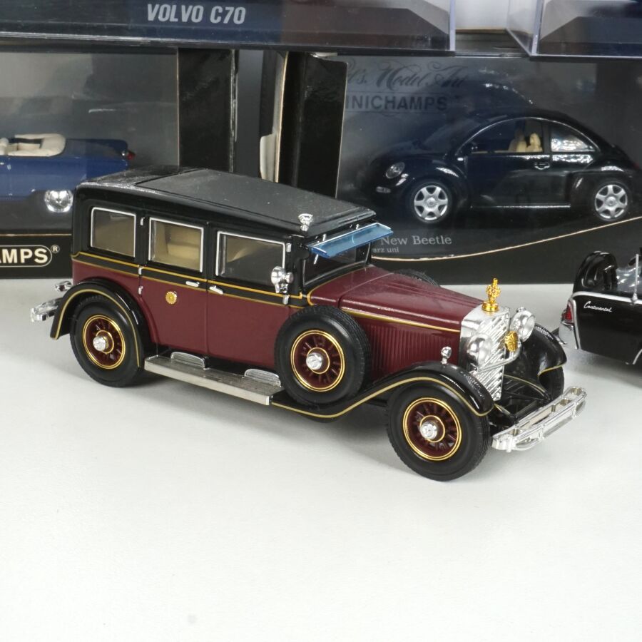 PAUL'S MODEL ART - MINICHAMPS : Ensemble de 10 véhicules, échelle 1/43ème, comprenant (1) VW New Beetle, noire ; (1) VW Golf Cabriolet, 1993, bleu métallique ; (1) Auto Union 1000 Sp Roadster, 1958, bleue ; (1) Volvo C70, couleur aubergine ; (1) Volvo V70, gris métallique ; (1) Volvo S60 rouge ; (1) Karmann Ghia 1200, couleur rouille ; (1) Mercedes-Benz 770K, bordeaux et noire ; (1) Alfa Roméo BC 2900 B Lungo 1938, bleu clair et (1) Lincoln Continental Presidential Parade Vehicle "X-100", 1961, noire, 6 présentés sur socle, 3 en boîte d'origine.