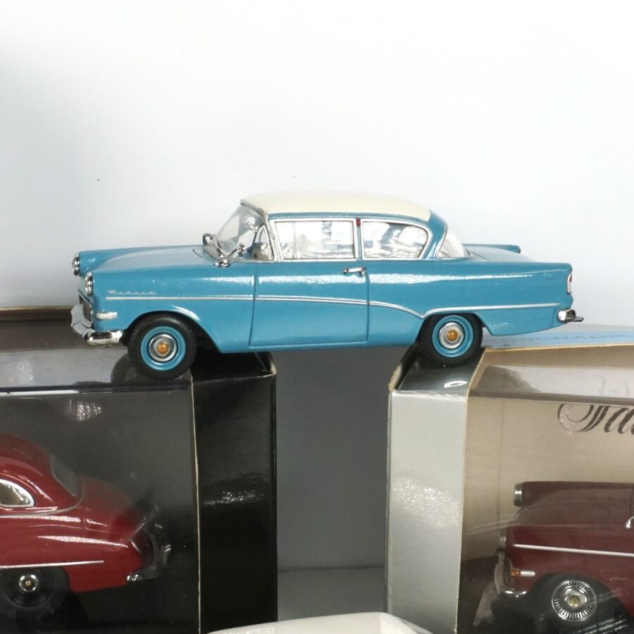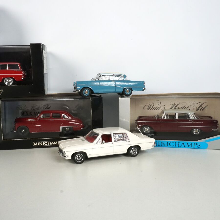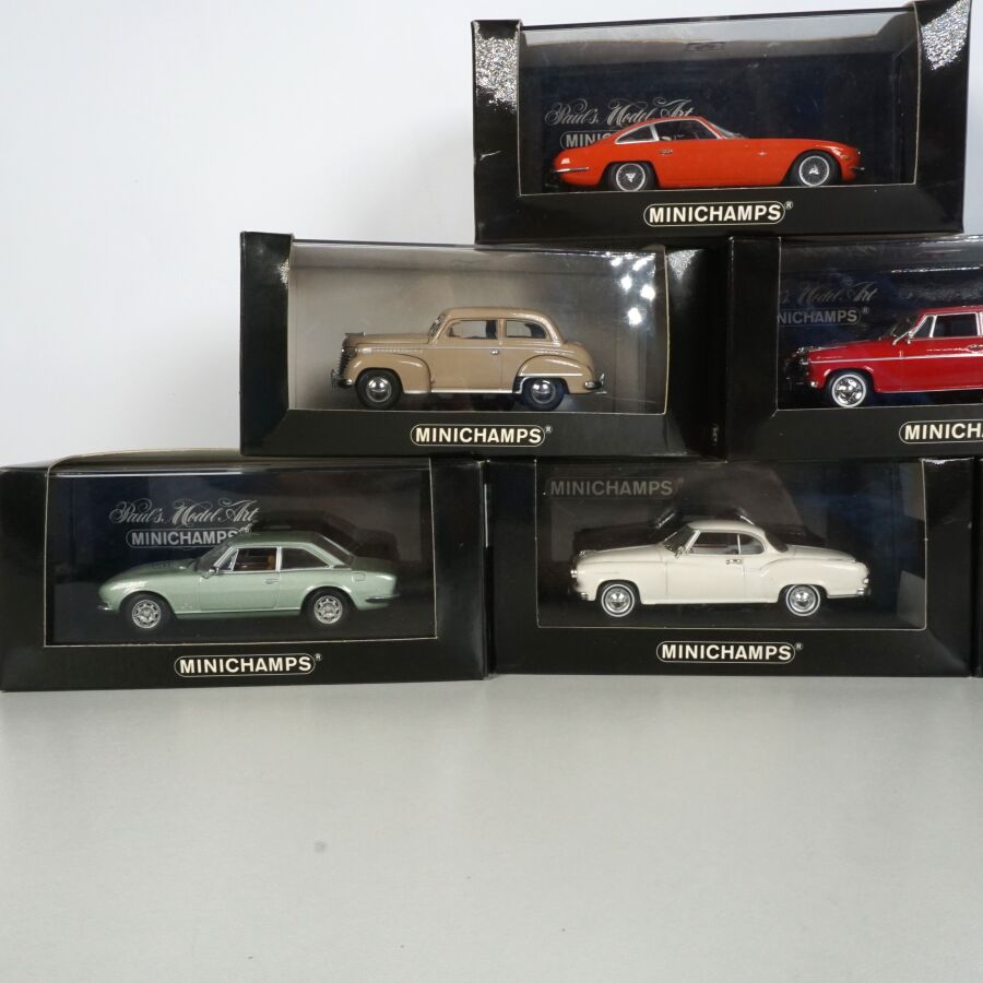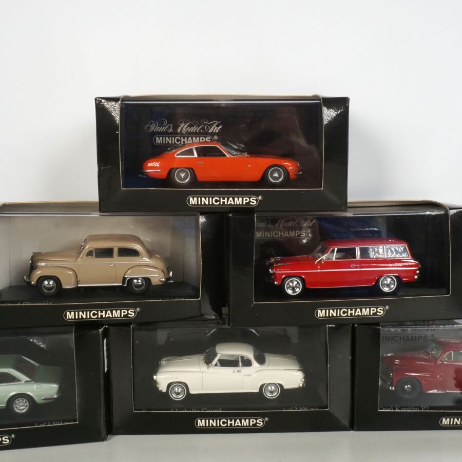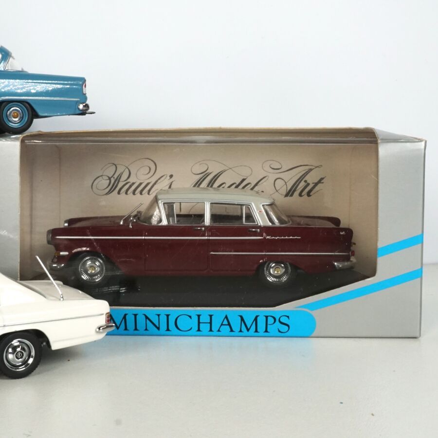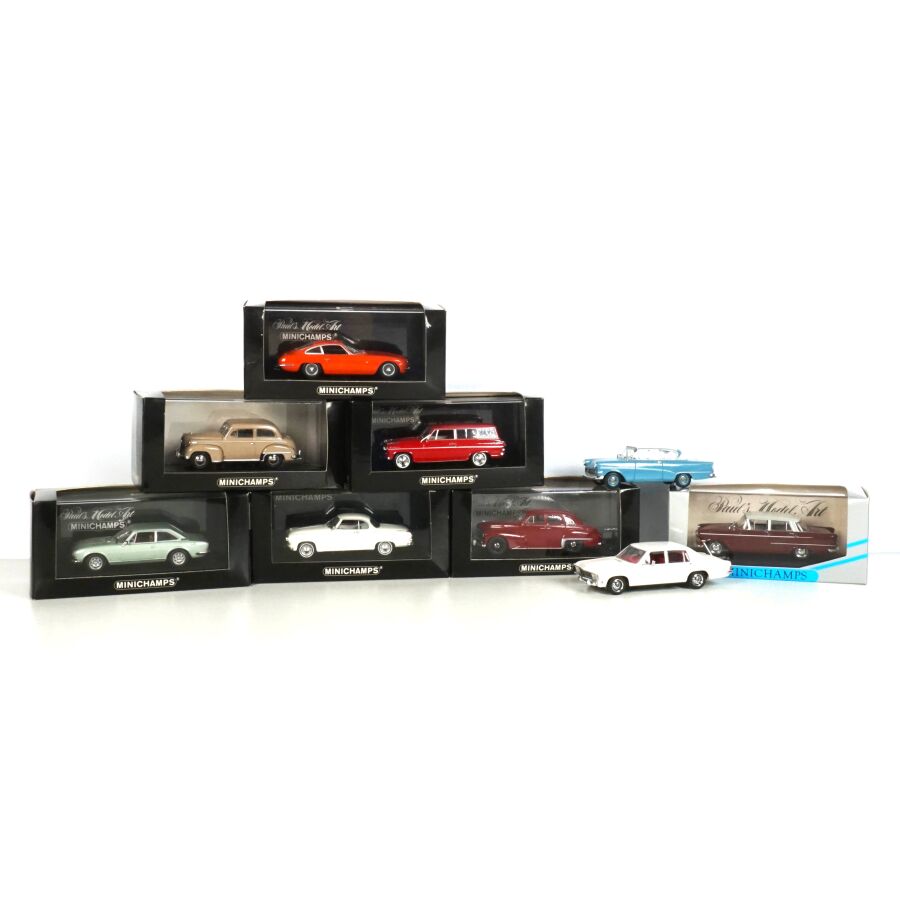PAUL'S MODEL ART - MINICHAMPS : Ensemble de 9 véhicules, échelle 1/43ème, comprenant (1) Opel Kapitän, 1951-53, réf. 430 043300, bordeaux ; (1) Opel Olympia, 1952, réf. 430 040404, beige ; (1) Opel Kapitän P2, 1959, réf. 430 040002, bordeaux ; (1) Borgward Isabella, 1958, réf. 400 096010, rouge ; (1) Lamborghini 400 GT 2+2, 1964, réf. 430 103302, orange ; (1) Borgward Isabella, 1959, réf. 400 096000, argent ; (1) Peugeot 504 coupé, 1974, réf. 400 112120, vert clair métallisé ; (1) Opel Kapitän-Admiral-Diplomat E, 1969-77, blanche et (1) Opel Rekord A, bleue toit blanc, 7 présentés en boite d'origine.