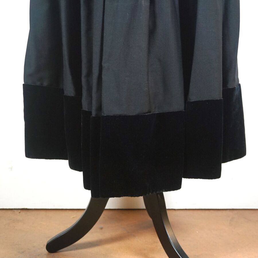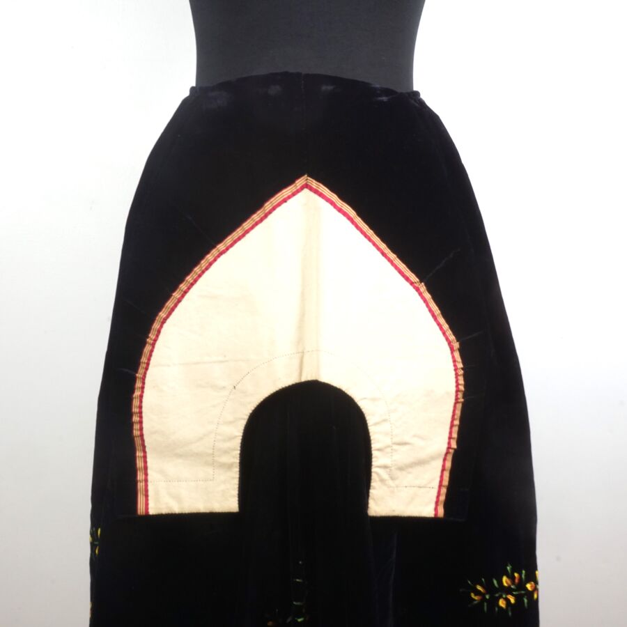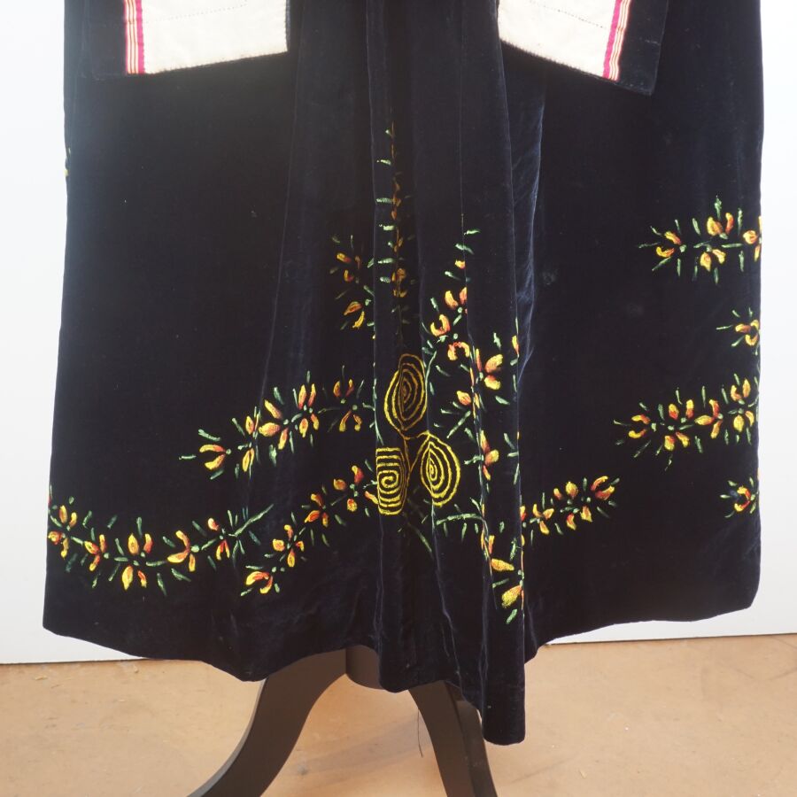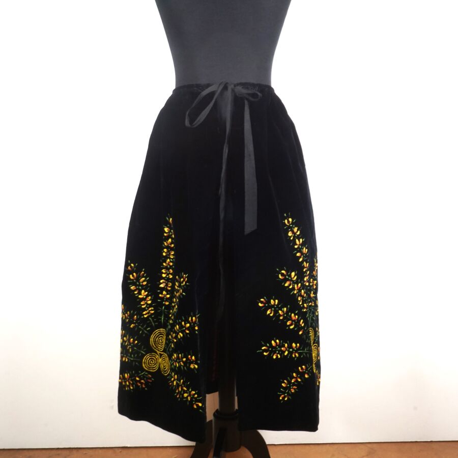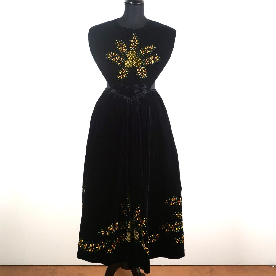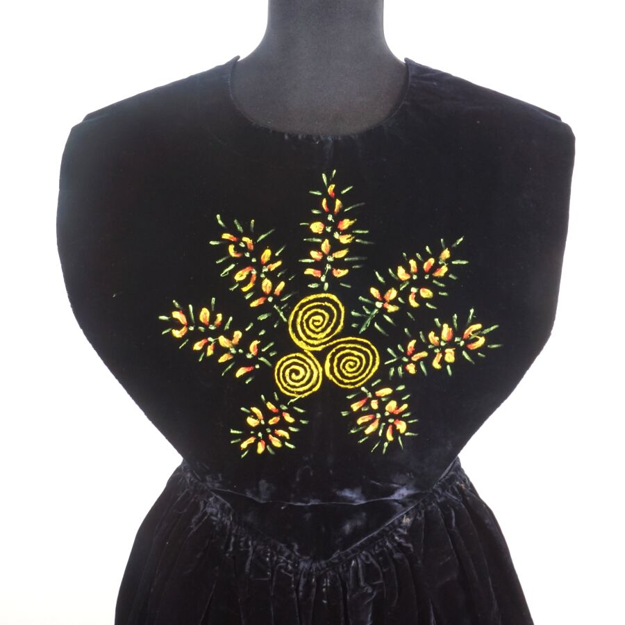 - Un tablier noir à décor brodé en jaune et vert de tiges florales et motifs rayonnants