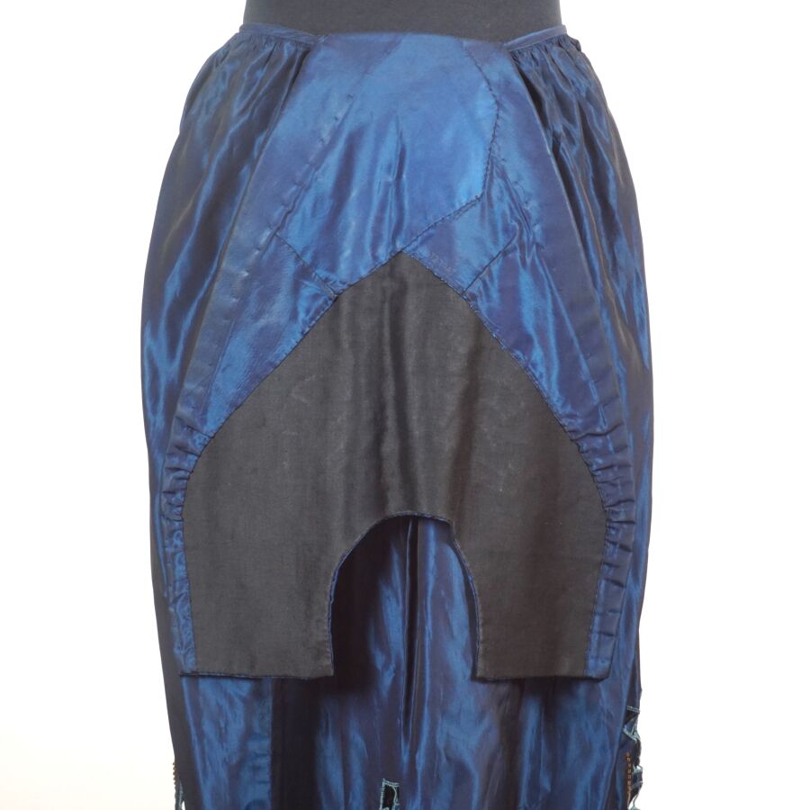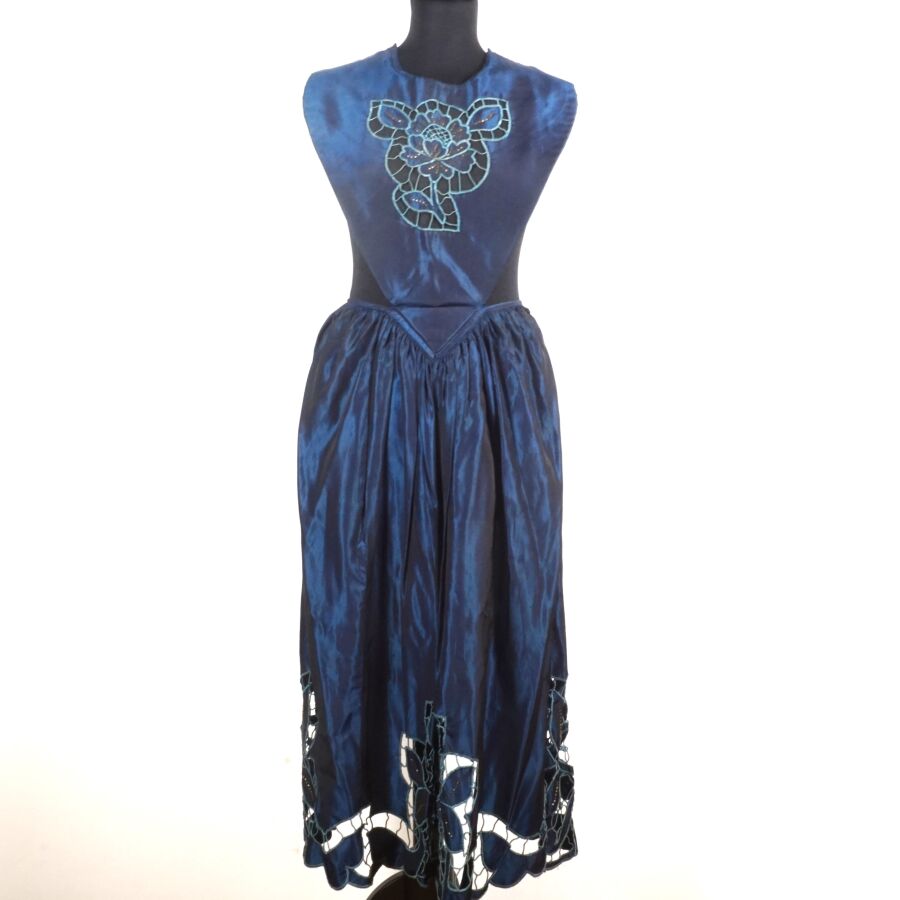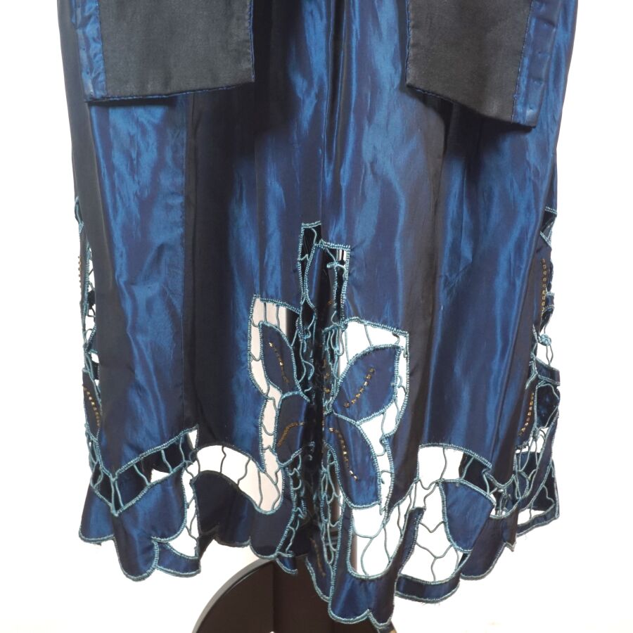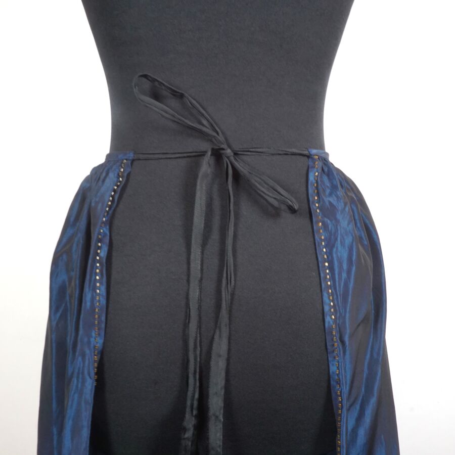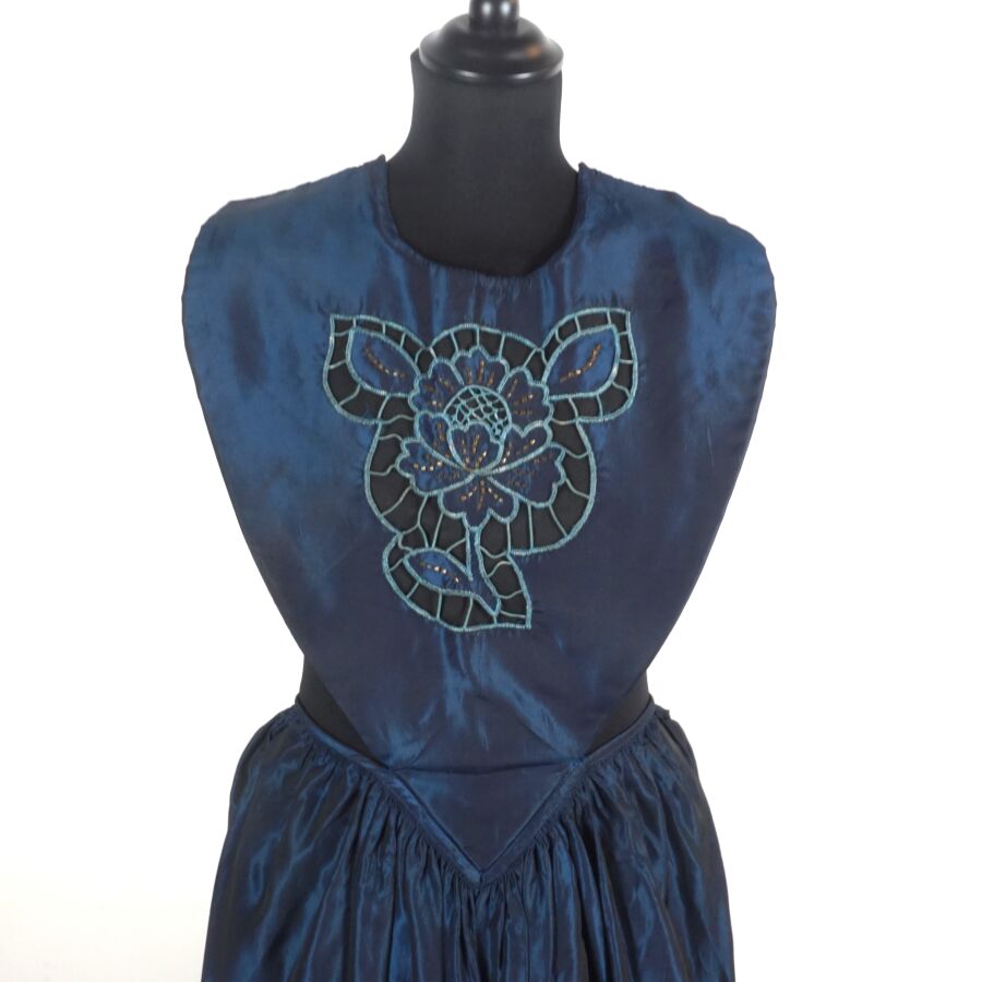 - Un tablier bleu nuancé à décor floral ajouré en partie basse et brodé de perles de fantaisie ocre sur la bordure
