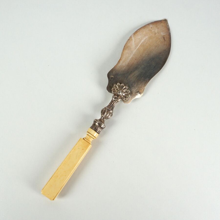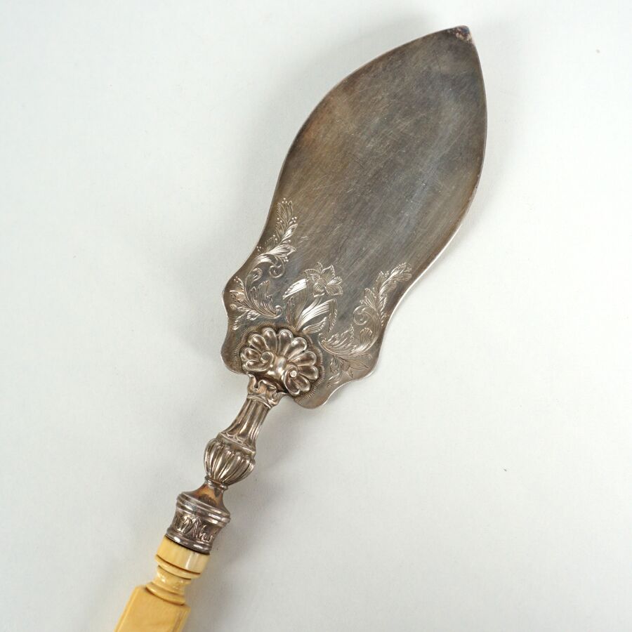 Pelle à tarte, argent poinçon Vieillard, grosse garantie Paris, à décor ciselé de fleurs et feuillages, virole surmontée d'une coquille, manche en bakélite à l'imitation de l'ivoire, L. 30.5 cm. Poids brut : 117 g environ.