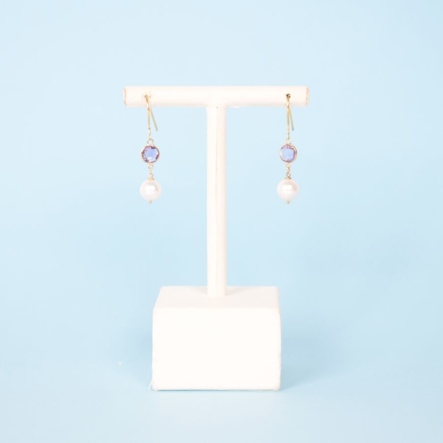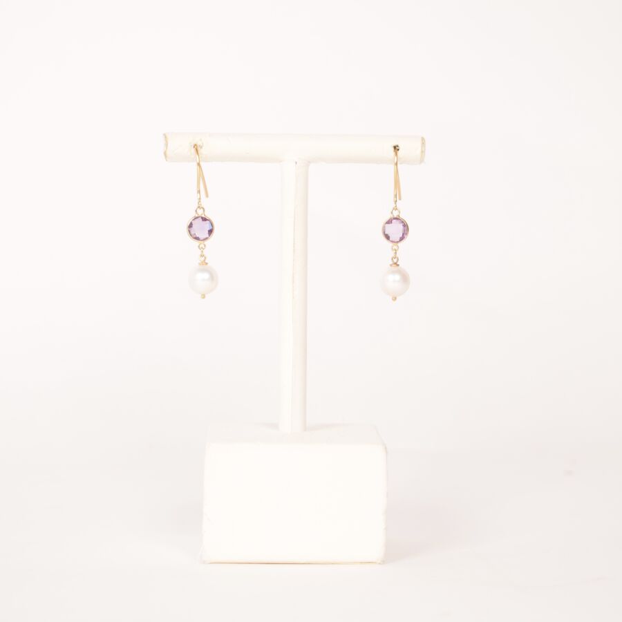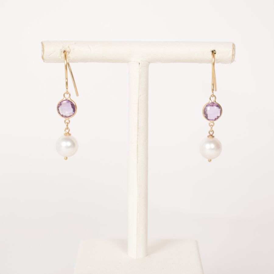 Pendants d'oreilles en or jaune 18K (750/oo), ornés de deux perles de culture d'eau douce mesurant 7 à 7.5 mm, surmontées de deux améthystes ovales calibrant 1.4 ct. Poids brut : 2.2 g.