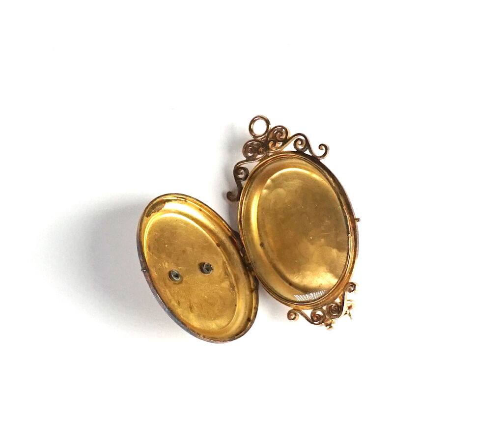 Pendentif-broche "Médaillon porte-photo" en or jaune 18K (750/oo), serti de petites perles et à décor feuillagé, verre intérieur, H. 3.8 cm. Poids brut : 6.1 g environ.