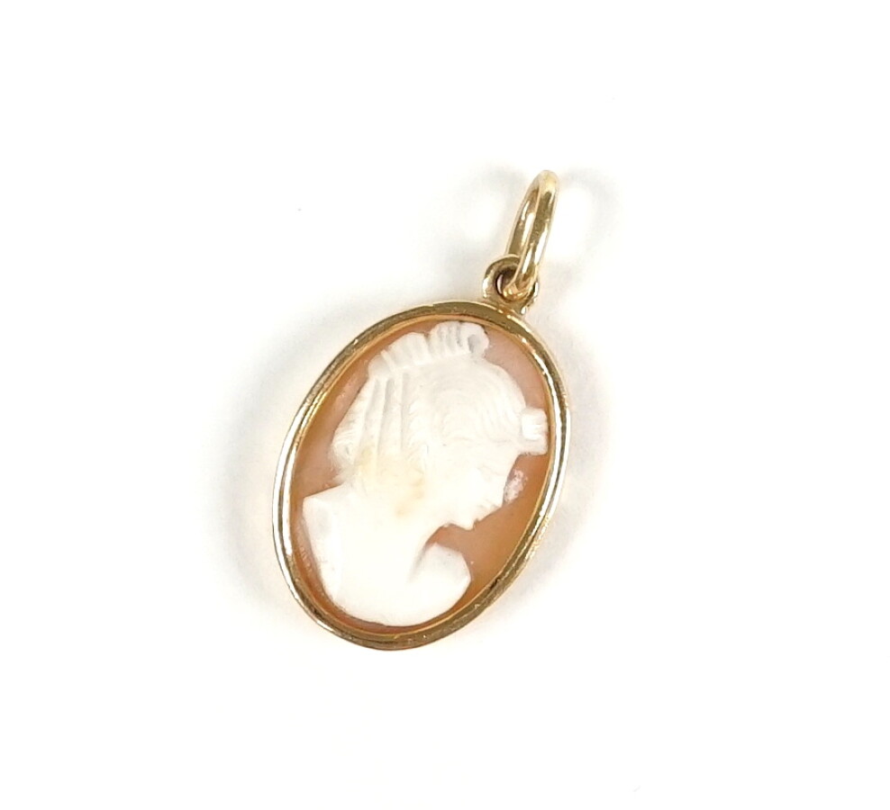 Pendentif "Camée" en or jaune 18K (750/oo) orné d'un profil de femme aux anglaises, H. 2.3 cm. Poids brut : 1.6 g environ.
