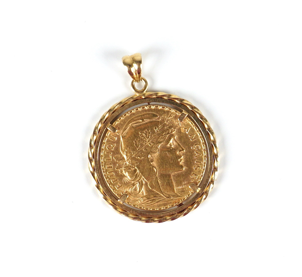Pendentif circulaire en or jaune 18 K (750/oo) agrémenté d'une pièce 20 Fr or République française "Marianne coq" 1907, monture torsadée, H. 3.3 cm, D. 2.5 cm. Poids brut : 9.4 g environ.