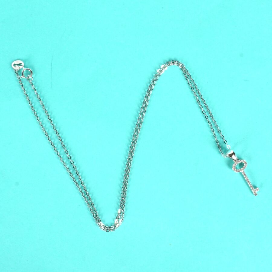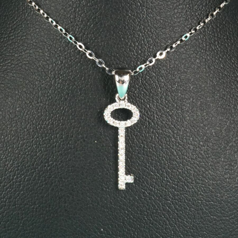 Pendentif "Clé", en or gris 18K (750/oo), chaîne maille forçat, pendentif serti de 23 diamants blancs taille moderne calibrant au total 0.10 ct environ, fermoir à anneau à ressort. L. 40 cm. Dim. Pendentif : 22 x 7 mm. Poids brut : 1.6 g environ.