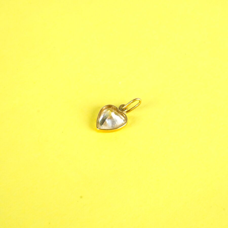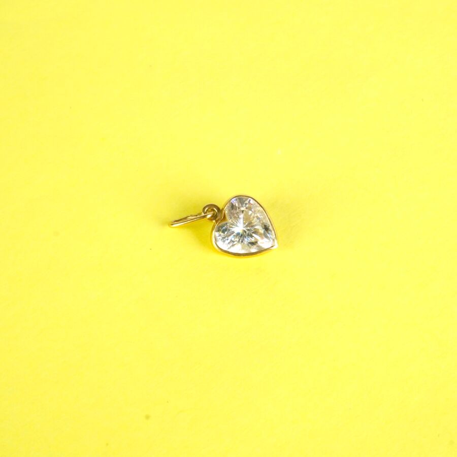 Pendentif "Coeur" en or jaune 18K (750/oo), sertie d'une pierre de fantaisie blanche à l'imitation du diamant, Dim. 1 x 0.8 cm. Poids brut : 0.7 g environ.