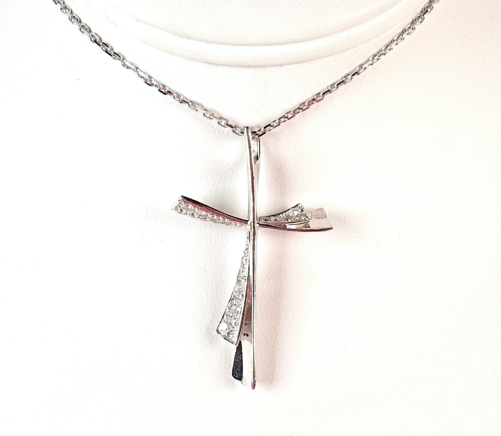 Pendentif "Croix" en or blanc 18 K (750/oo), les branches se dédoublant et partiellement pavées de 28 diamants taille moderne pesant ensemble 0.35 ct, H. 4 cm.