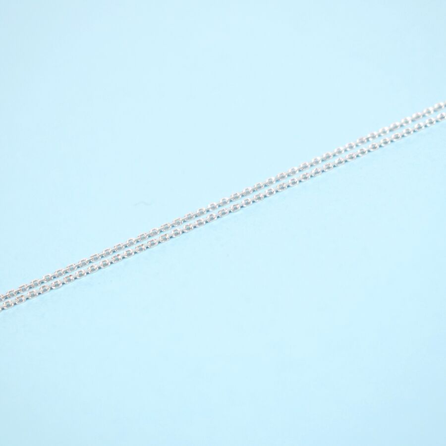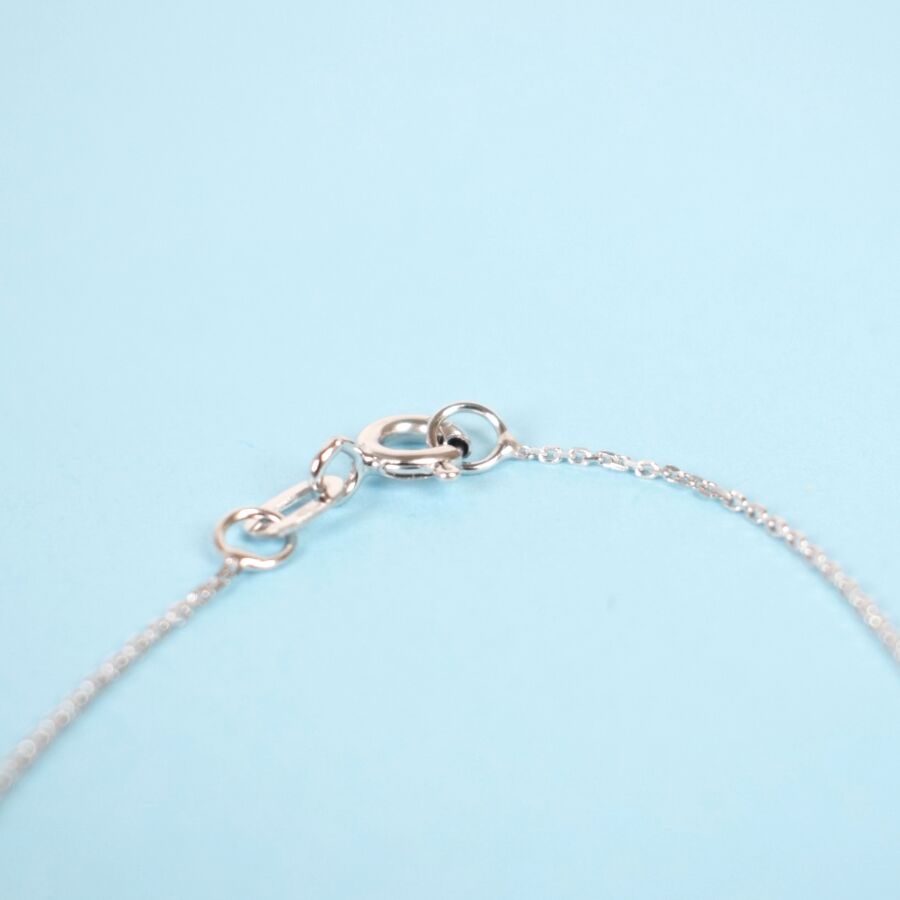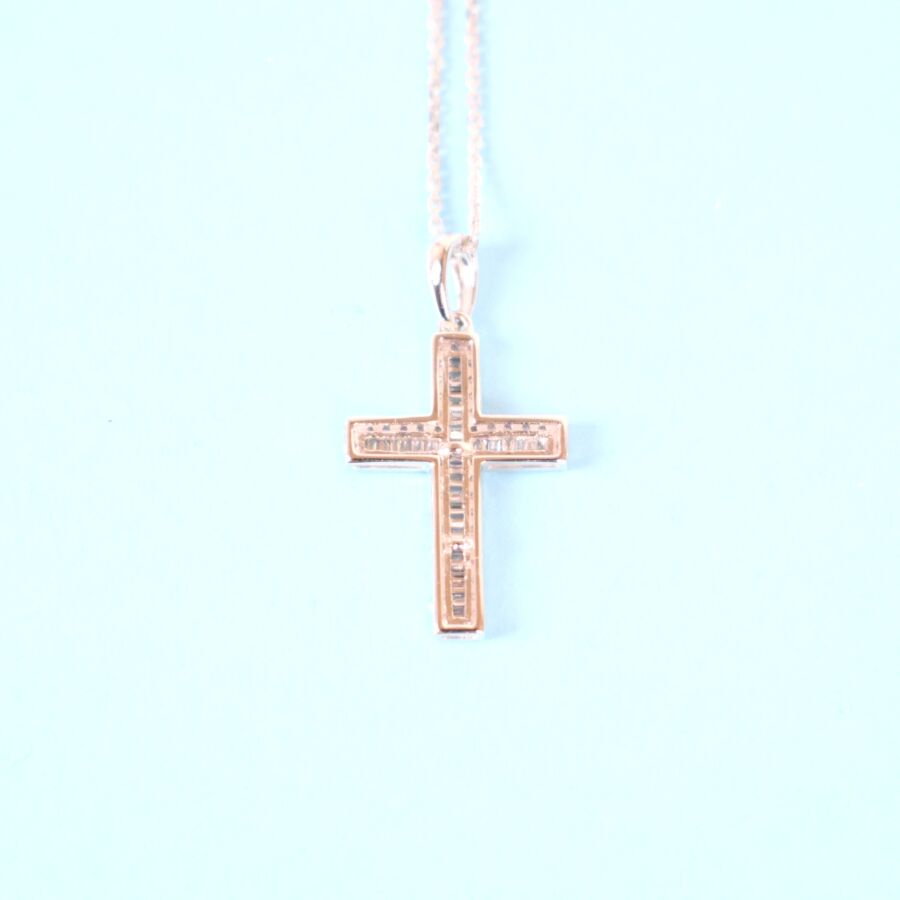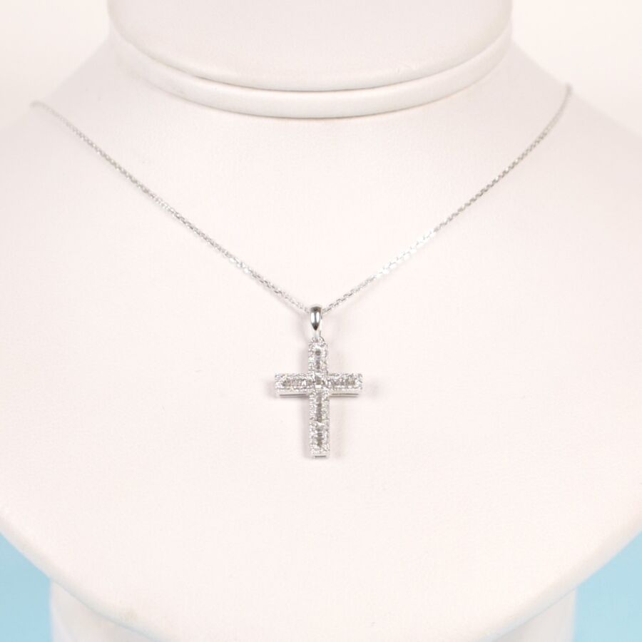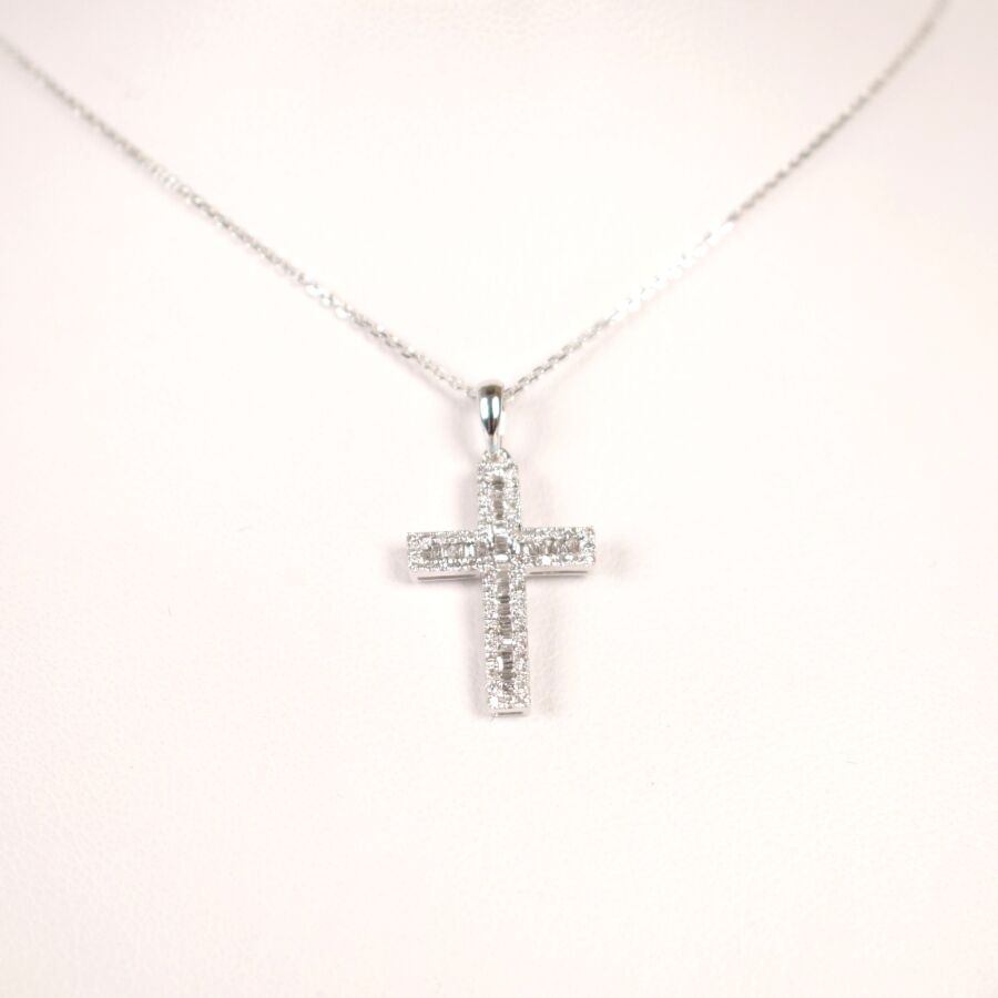 Pendentif croix en or blanc 18K (750/oo) et sa chaîne à maille forçat diamantée en or blanc 18K (750/000), serti en son centre de 31 diamants blancs taille tapers, calibrant environ 0,10 ct, dans un entourage de 58 diamants blancs taille moderne pour environ 0,10 ct. Long. de la chaîne : 45 cm, Dim. 12 x 12 cm, Poids brut : 2.20 g.