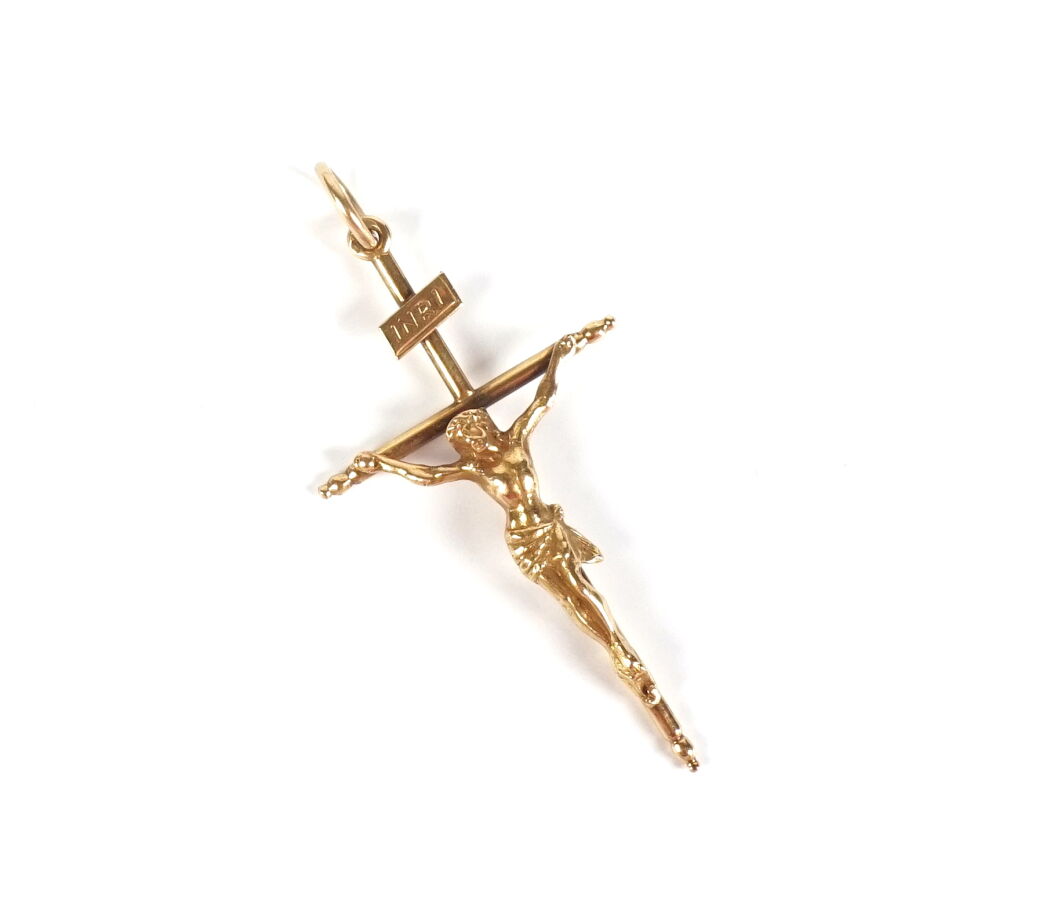 Pendentif "Croix" en or jaune 18K (750/oo), orné du Christ en ronde bosse, H. 6 cm. Poids brut : 7.7 g environ.