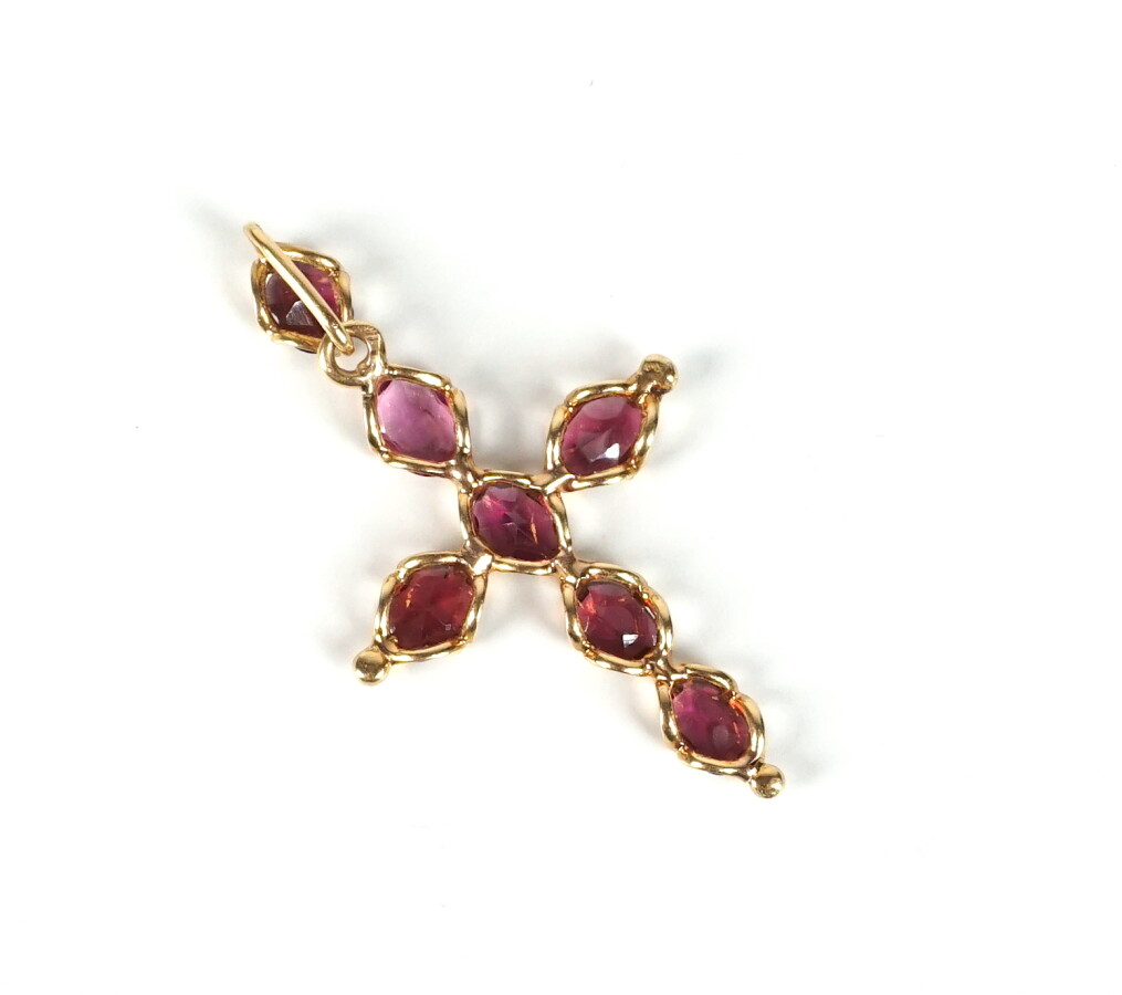 Pendentif "Croix" en or jaune 18K (750/oo), sertie de 6 grenats de taille ovale irrégulière (égrisures), la première pierre sous la bélière remplacée par un saphir violet taille ovale, H. 4.7 cm. Poids brut : 3.8 g environ.