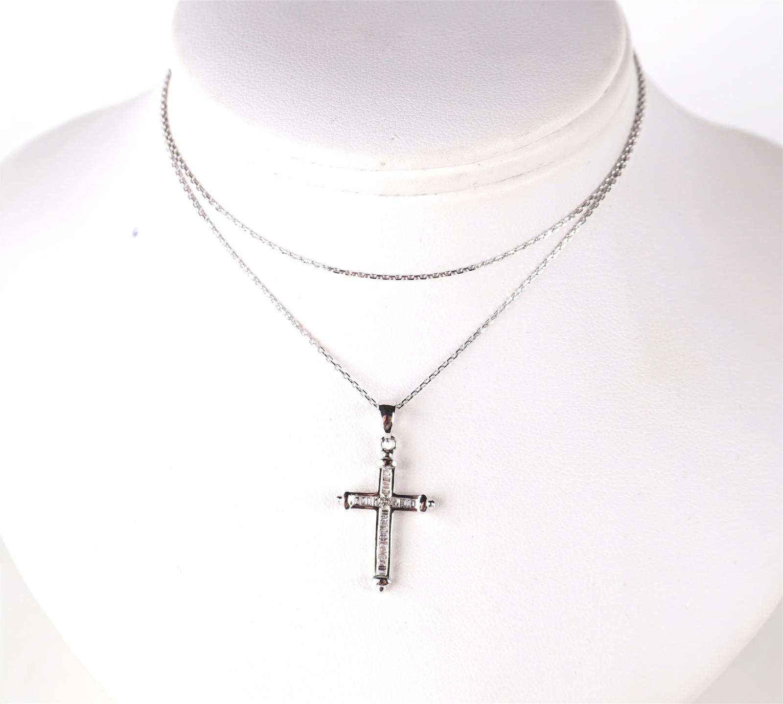 Pendentif "Croix" et sa chaîne maille forçat diamantée or blanc 18 K (750/oo), serti d'un diamant blanc taille moderne 0,02 ct et de 23 diamants blancs taille baguette 0,10 ct. Dim. pendentif : 25 x 13 mm. L. de la chaîne : 45 cm. Poids brut : 2.15 g environ.