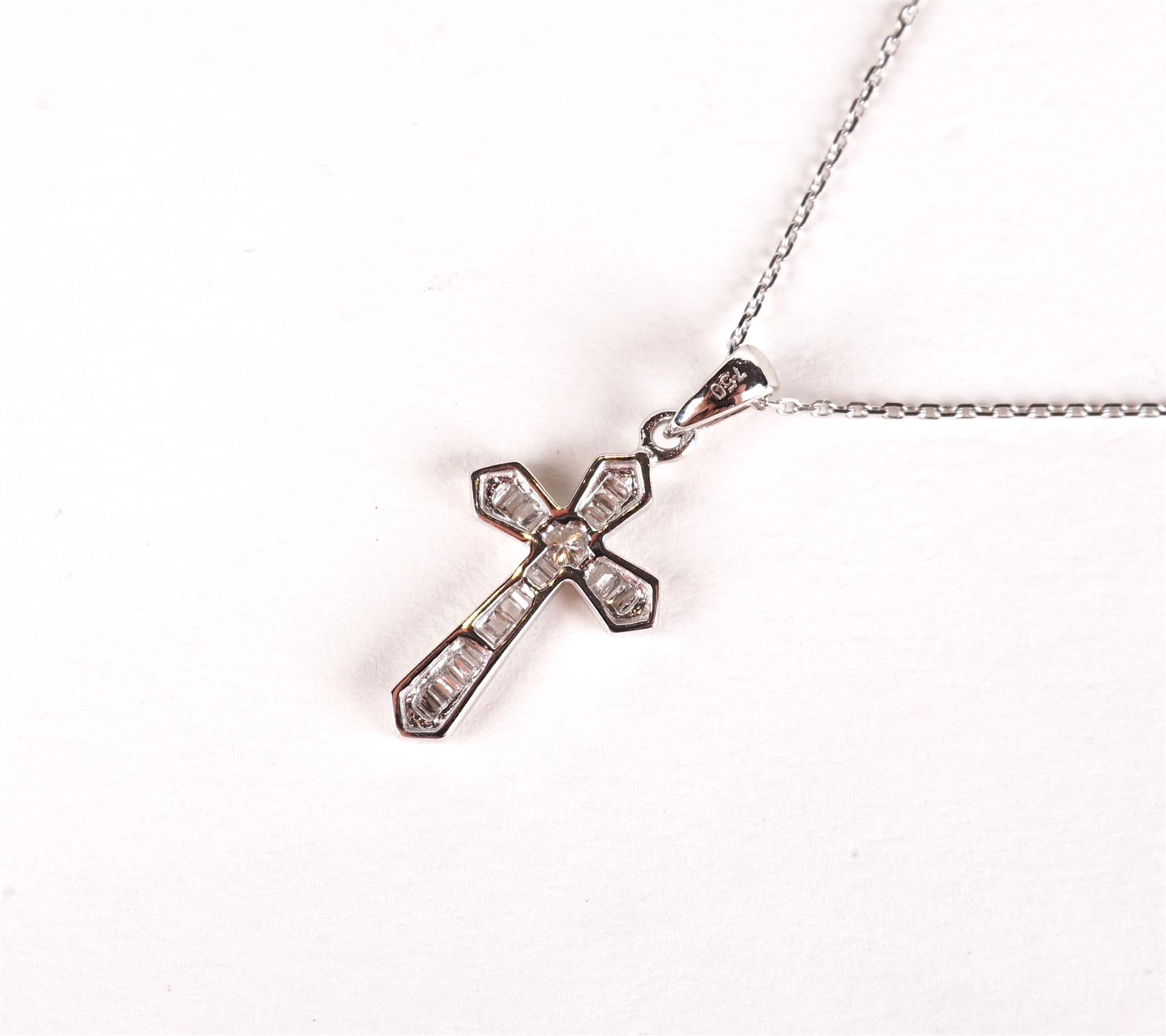 Pendentif "Croix" et sa chaîne maille forçat diamantée en or blanc 18 K (750/oo) serti d'un diamant blanc taille moderne 0,03 ct et de 20 diamants blancs taille baguette 0,10 ct. Longueur de la chaîne 45 cm. Dimensions du pendentif 23 x 11 mm. Poids brut : 2.15 g environ.