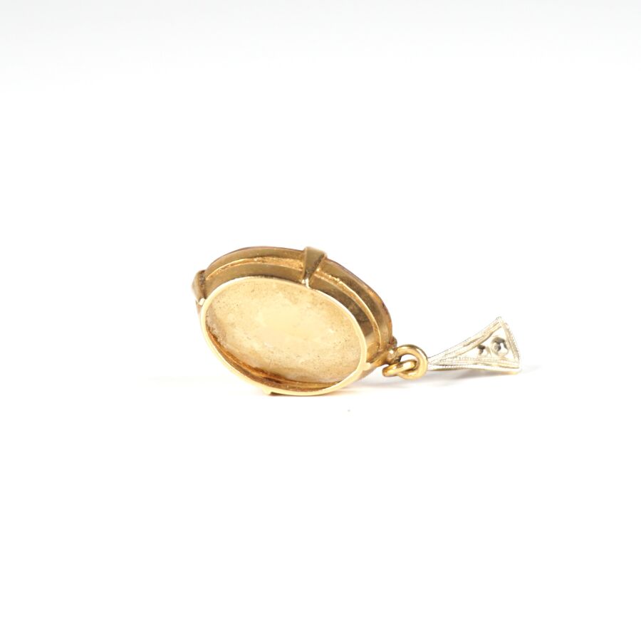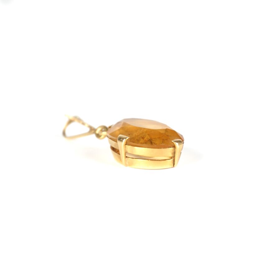Pendentif de forme ovale en or jaune 18K (750/oo) serti quatre griffes d'une citrine facettée de taille ovale (D. 1.4 x 1 cm), H. Avec bélière : 2.8 cm. Poids brut : 2 g environ.