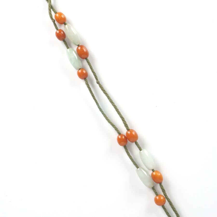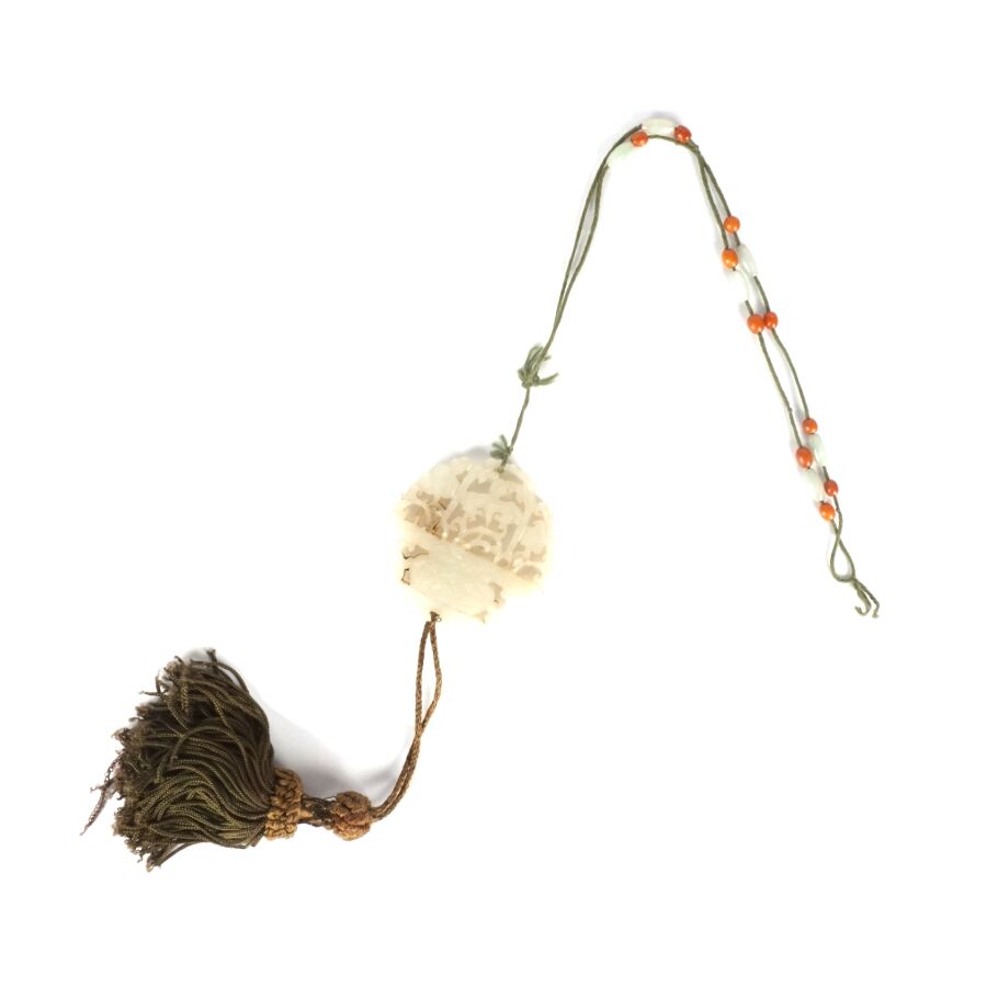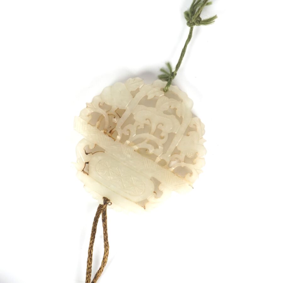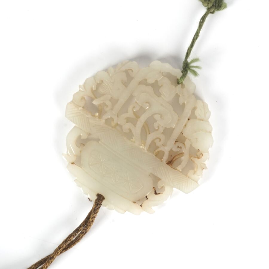 Pendentif en jade blanc légèrement céladon, en forme de panier garni de fleurs suspendu à une cordelette verte composée de perles de corail et jadéite, Chine, circa 1900, Dim. Médaillon : 6.1 x 6.1 cm (égrenures).