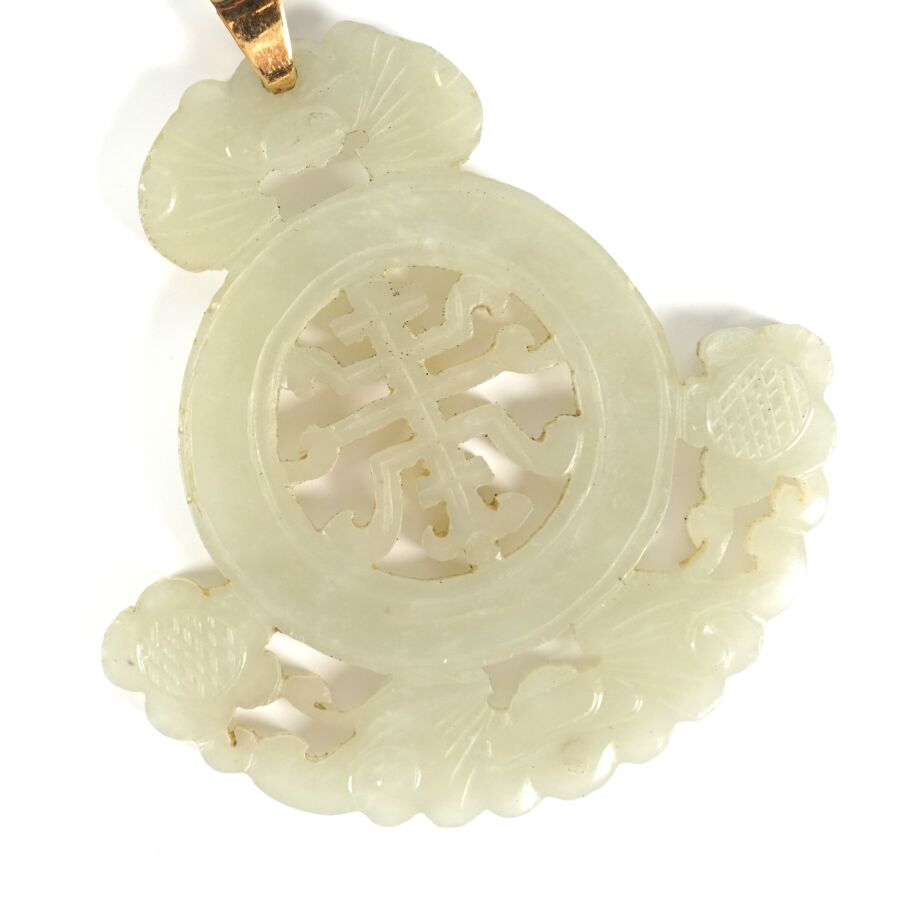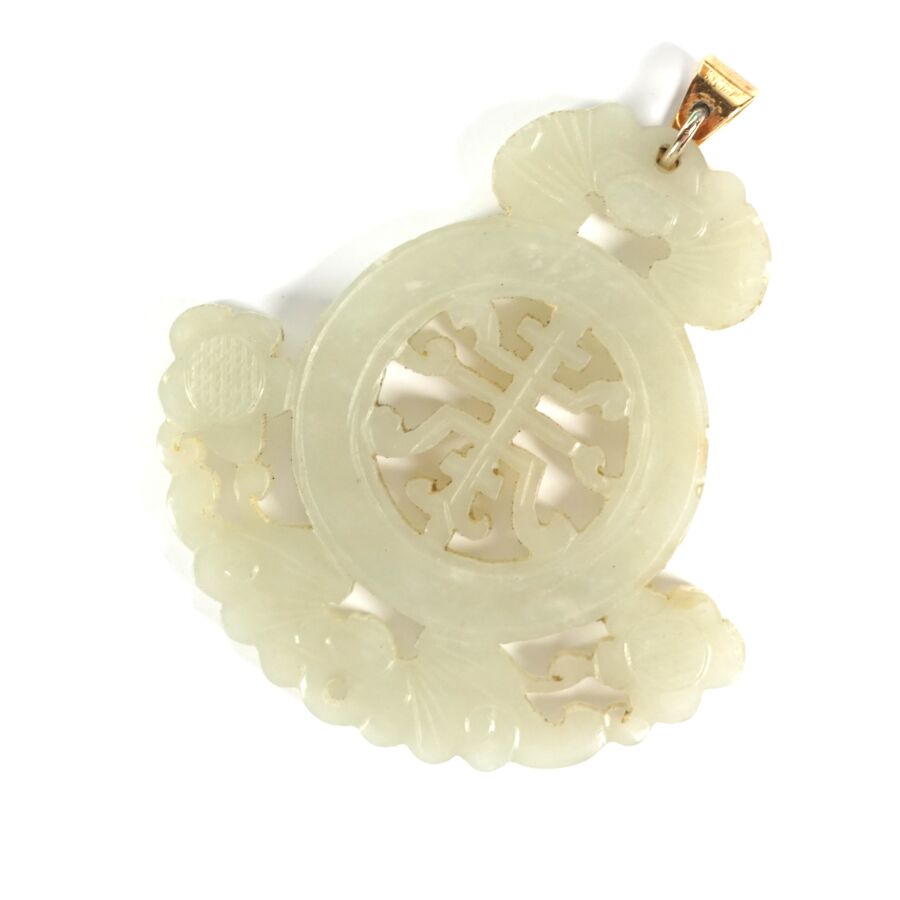 Pendentif en jade blanc légèrement céladon représentant un disque dans lequel se trouve le caractère Fu, le pourtour entouré de chauve-souris stylisées et tiges feuillagées, Chine, 19ème siècle, H. Hors bélière : 5.9 cm. Poids brut : 23.2 g environ.