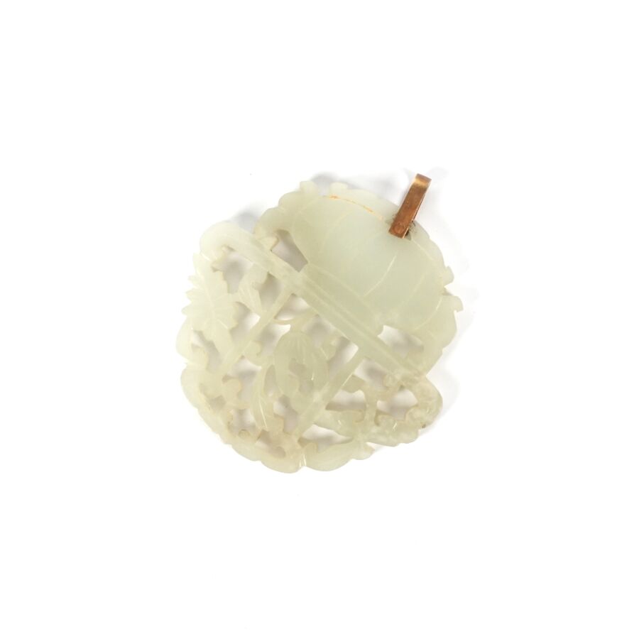 Pendentif en jade céladon, à motif ajouré d'un panier garni d'une branche de lingzhi, main de bouddha et fleur, la bélière en laiton doré, Chine, 20ème siècle, Dim. Hors bélière : 5.5 x 5.3 cm.