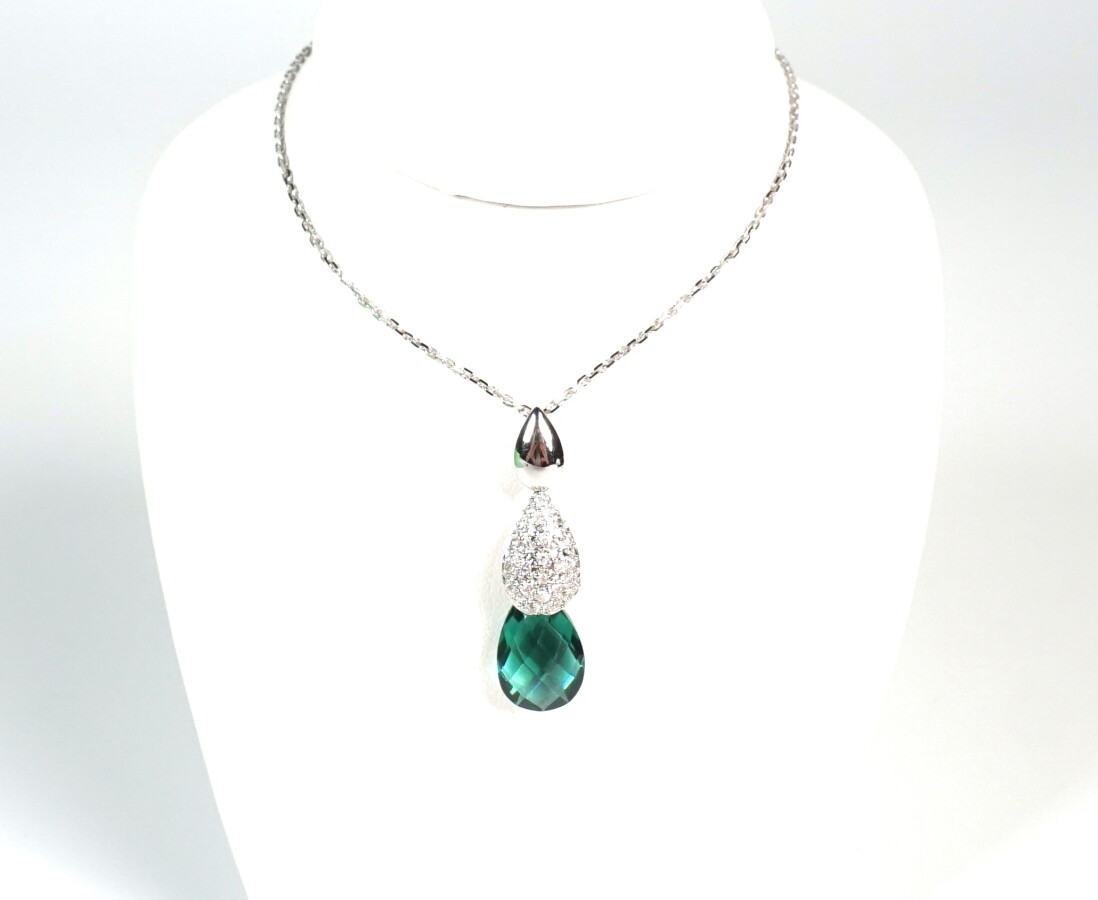 Pendentif en or blanc 18K (750/oo) orné d'une prasiolite (quartz vert) calibrant 2.80 cts, agrémentée de 22 diamants ronds taille moderne pour 0.10 ct, H. cm.
