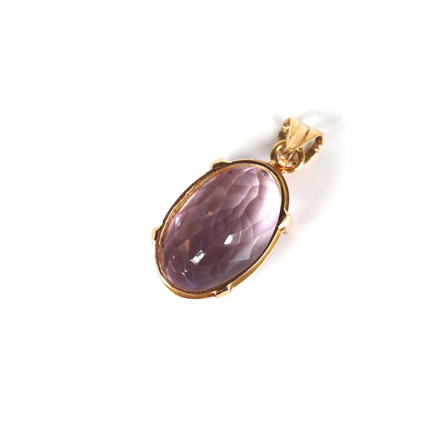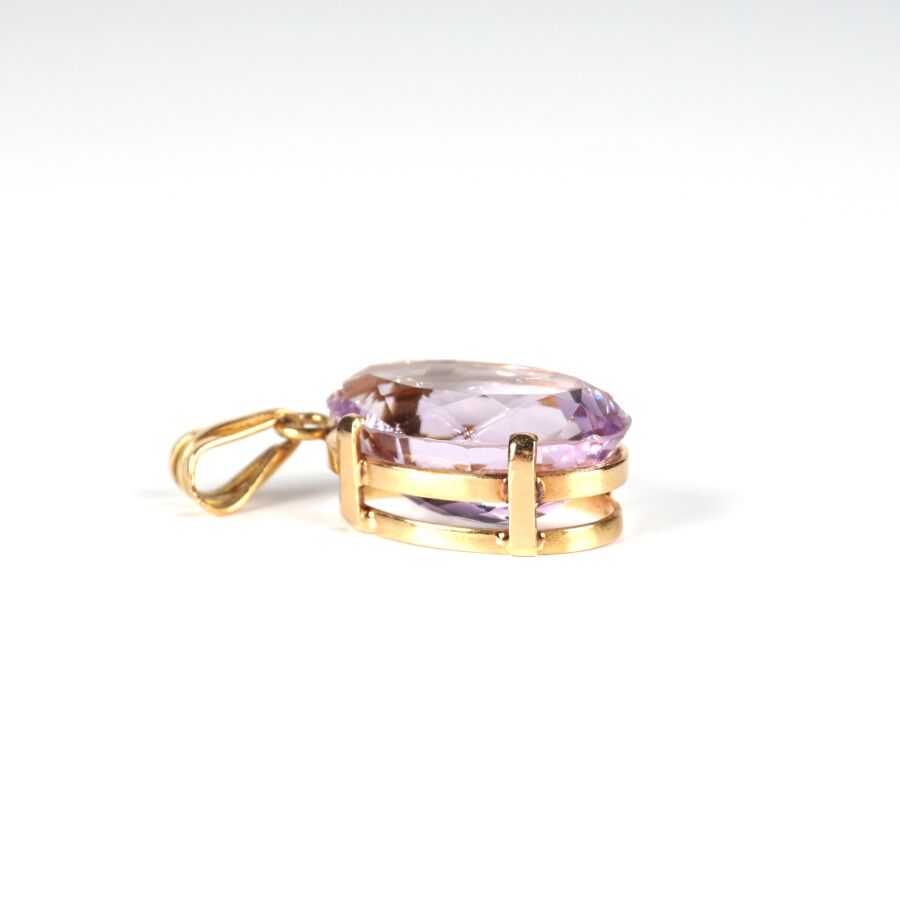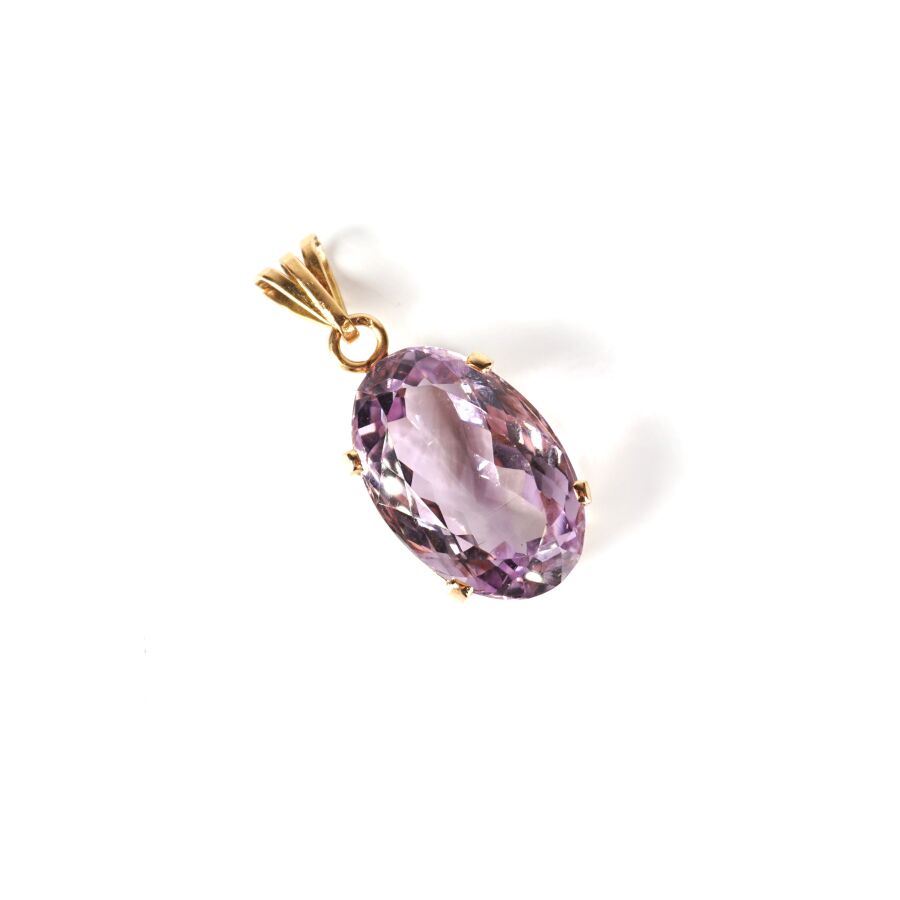 Pendentif en or jaune 18K (750/oo) serti d'une importante améthyste facettée de taille ovale (D. 2.45 x 1.7 cm), H. Totale (avec bélière) : 4 cm. Poids brut : 11.2 g environ.