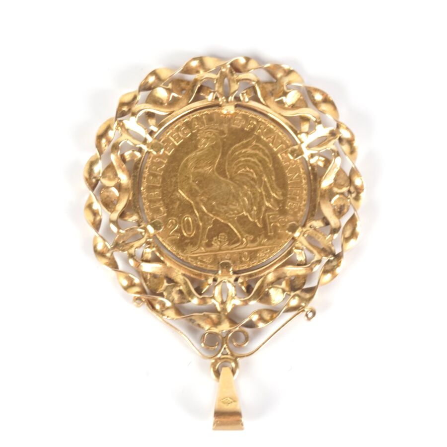 Pendentif en or jaune 18K (750/oo), sertie au centre d'une monnaie 20 Francs or Marianne coq, 1910, dans un encadrement d'entrelacs, Diam. 3.5 cm. H. Avec bélière : 4.7 cm. Poids brut : 11.3 g environ.