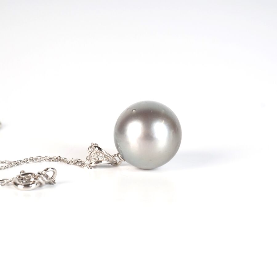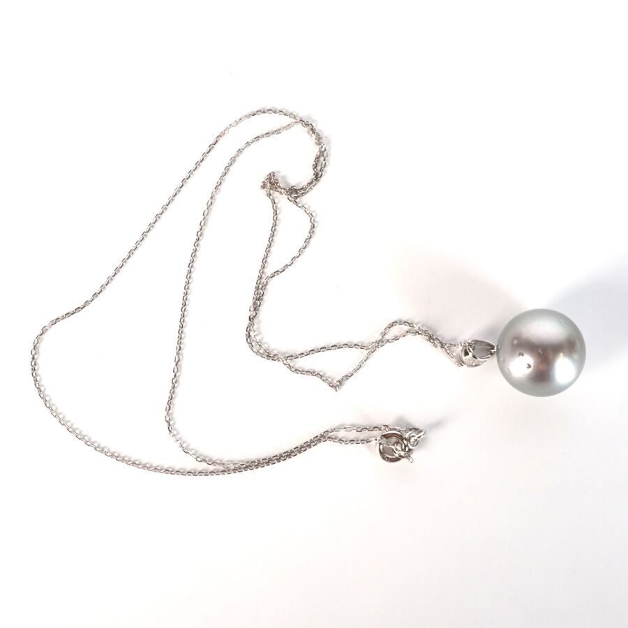 Pendentif et sa chaîne en or gris 18K (750/oo), chaîne maille forçat, pendentif formé d'une perle de culture de Tahiti (D. 13/13.5 mm), la bélière ornée de 4 diamants ronds calibrant au total 0.02 ct environ, L. 45 cm. Poids brut : 4.9 g environ.