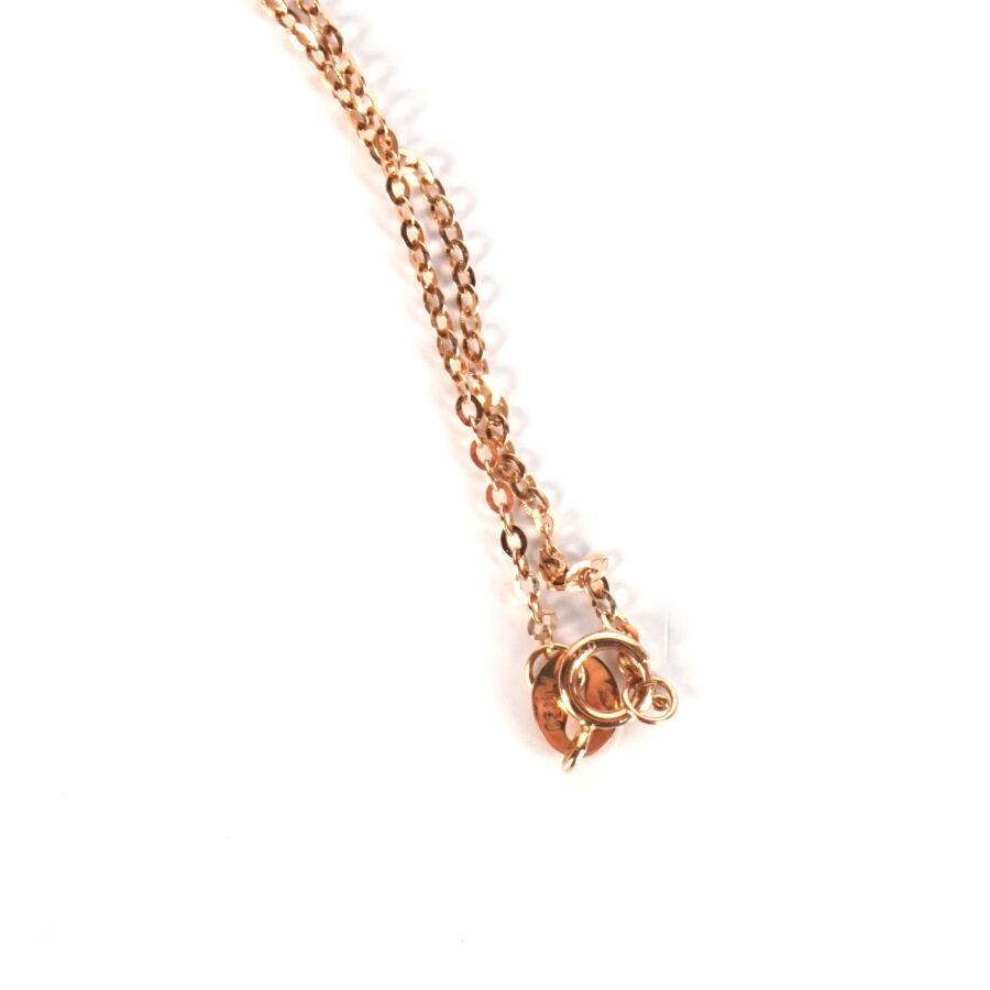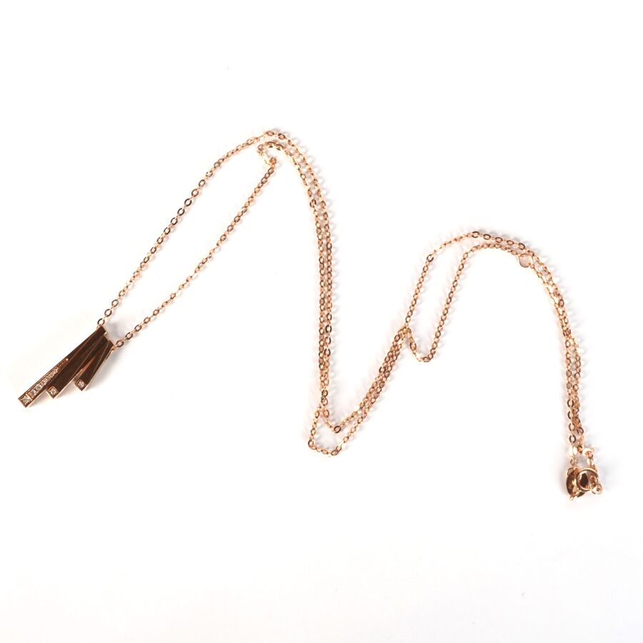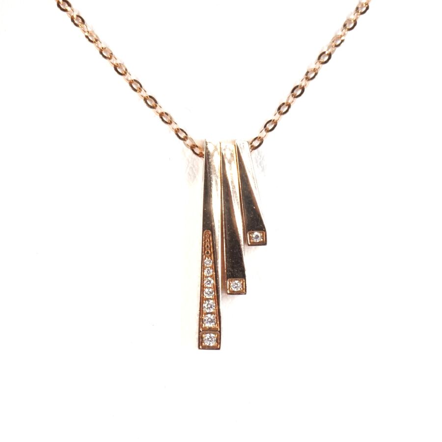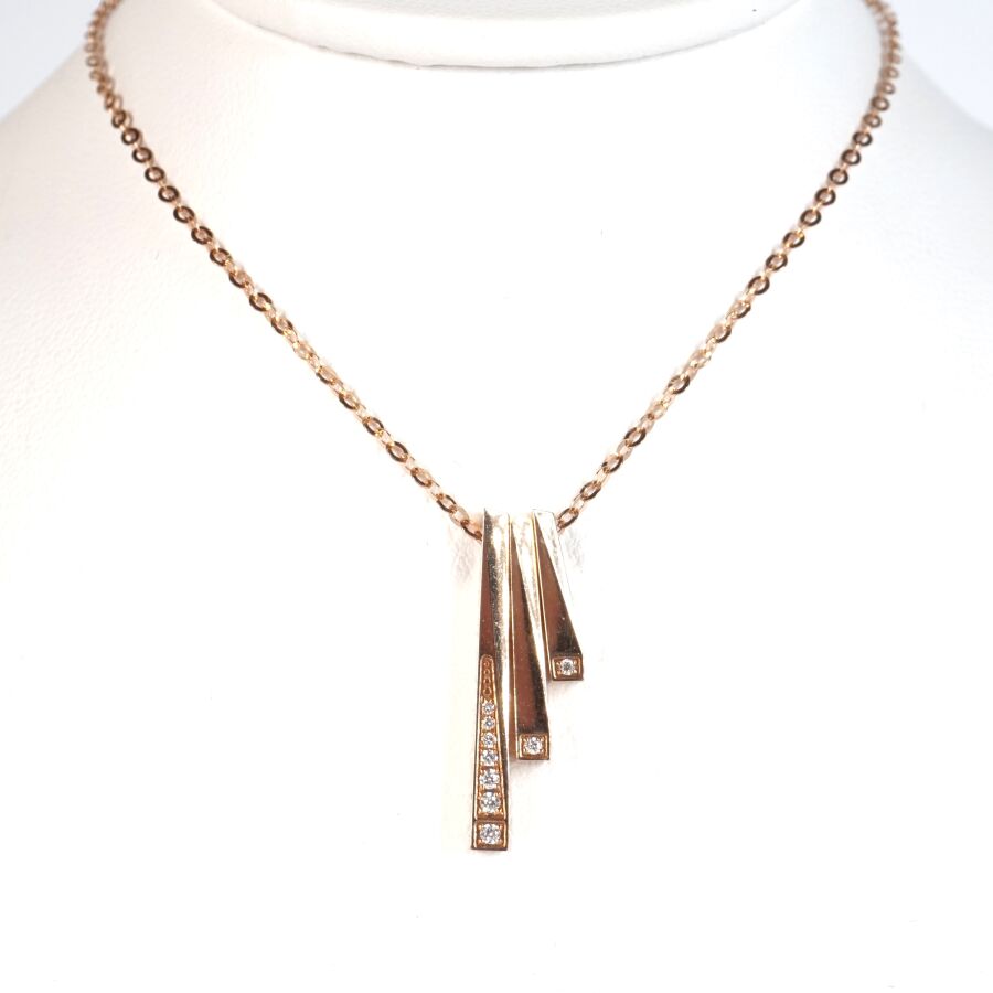 Pendentif et sa chaîne en or rose 18K (750/oo), chaîne maille forçat, pendentif composé de trois lignes mobiles en chute, serties au total de 9 diamants blancs taille moderne, calibrant ensemble 0.5 ct environ, fermoir à anneau ressort, L. 40 à 45 cm. Dim. Pendentif : 20 x 7 mm. Poids brut : 2.2 g environ.