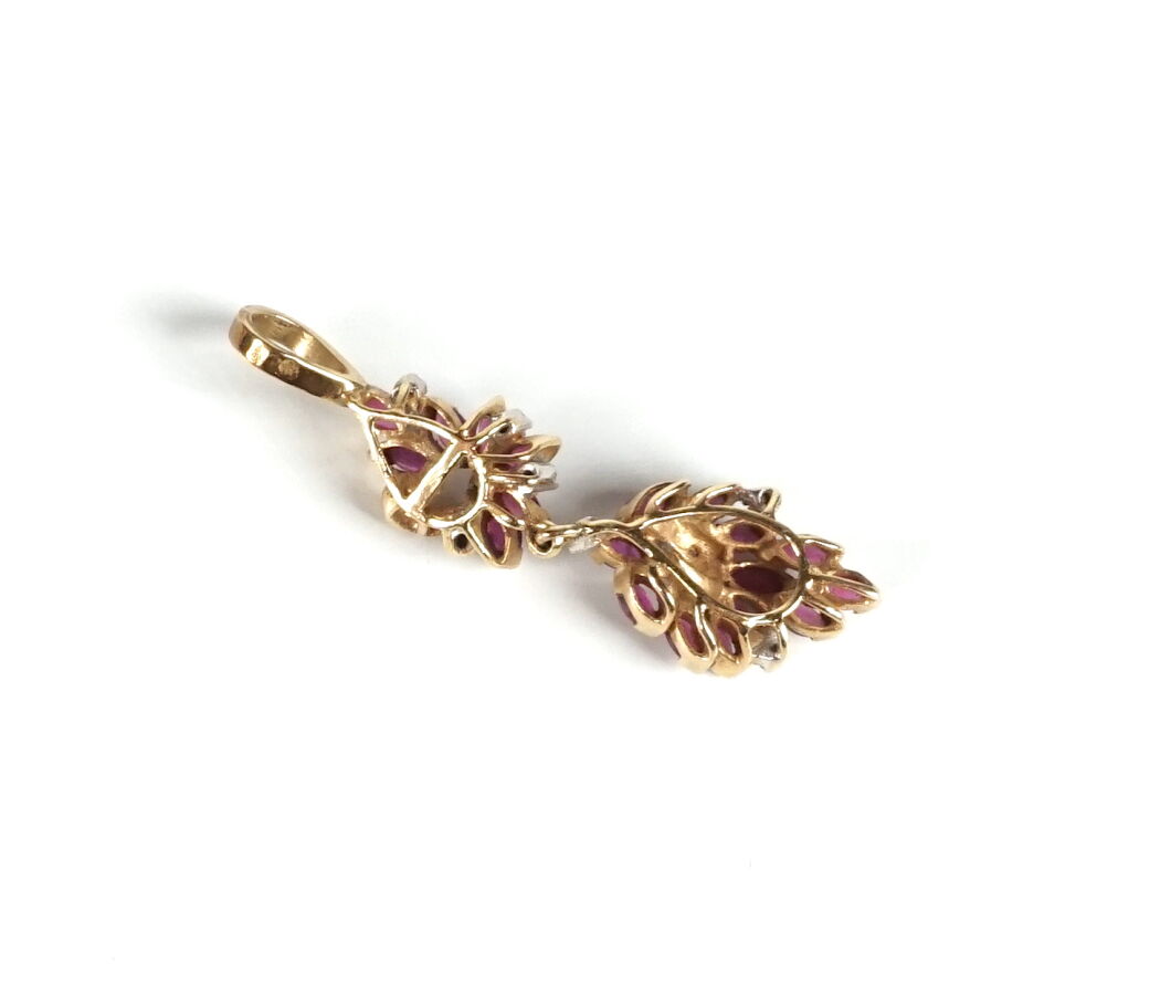 Pendentif "Feuillage" articulé en or jaune 14K (585/oo), serti de pierres rouges taille navette, probablement des spinelles, ponctuées de petits diamants, H. 4.2 cm. Poids brut : 3.5 g environ.