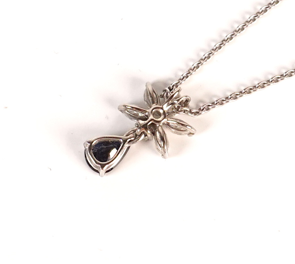 Pendentif "Fleur" et sa chaîne en or blanc 18K (750/oo), présentant une goutte de saphir mobile, retenue par une fleur composée de 4 diamants taille navette, 1 diamant poire et 1 diamant rond, H. 2 cm. Poids brut : 5.3 g environ.
