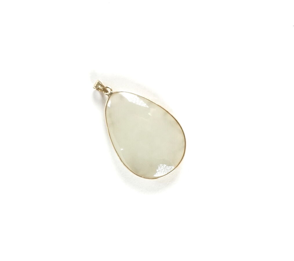 Pendentif "Goutte" en or jaune 14K (585/oo), à décor de 2 cygnes évoluant sur un lac parmi les roseaux, serti d'une pierre blanche taillée en poire cabochon, H. 4 cm. Poids brut : 9.9 g environ.