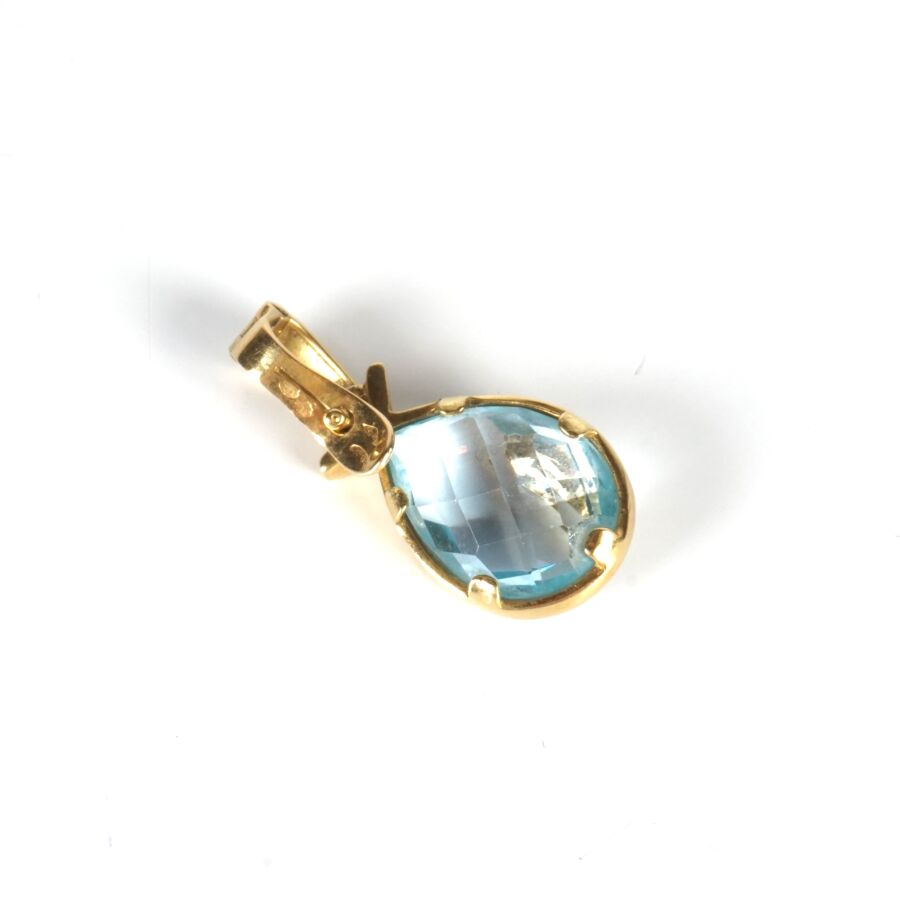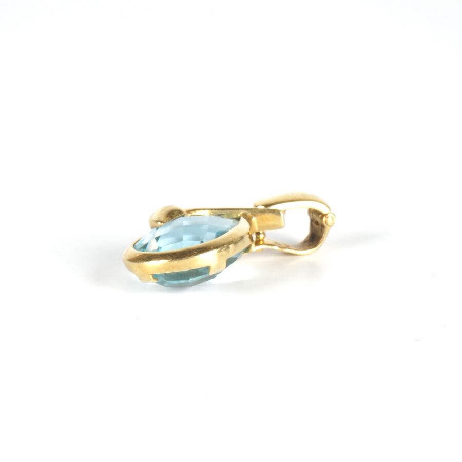 Pendentif "Goutte" en or jaune 18K (750/oo) à motif d'un serpent retenant une topaze bleue facettée de taille poire (D. 1.6 x 1.15 cm), l'oeil du serpent serti d'un diamant rond (D. 1.2 mm), H. Avec bélière : 2.7 cm. Poids brut : 5.2 g environ.