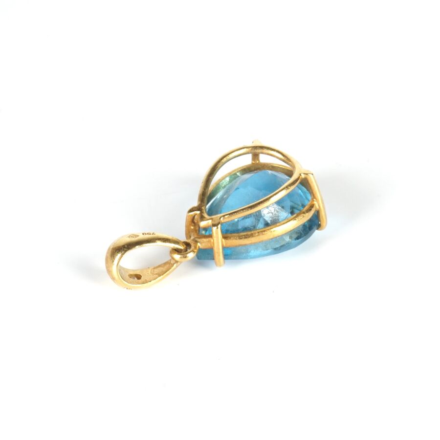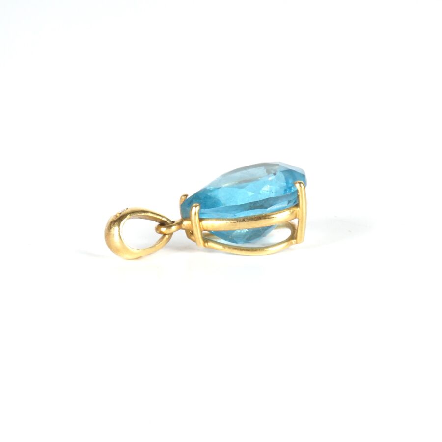 Pendentif "Goutte" en or jaune 18K (750/oo), serti d'une importante topaze bleue de taille poire (D. 1.6 x 1.1 cm), la bélière sertie d'un petit diamant taille brillant, H. Avec bélière : 2.5 cm. Poids brut : 4.6 g environ.