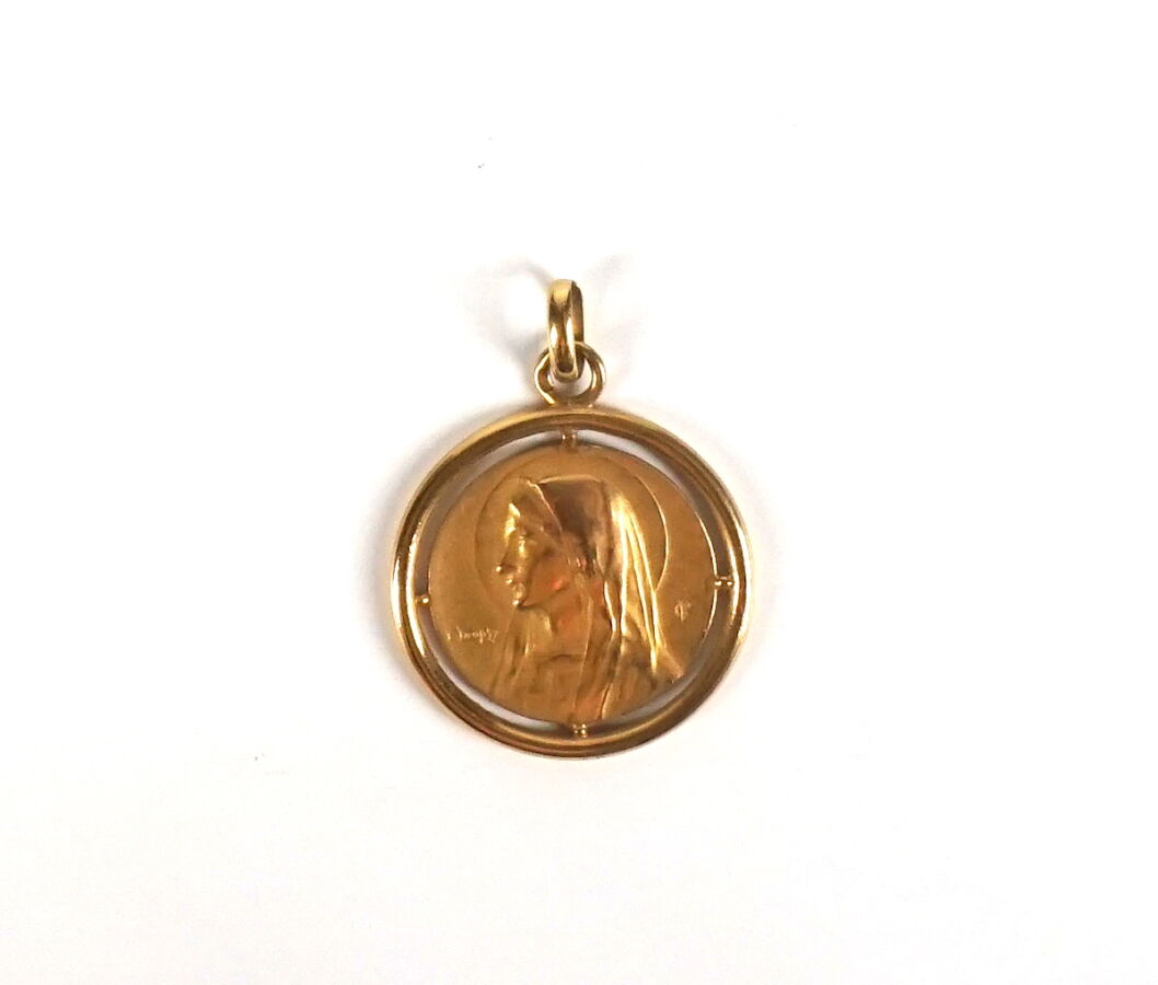 Pendentif "Médaille" en or jaune 18K (750/oo), à décor en léger bas-relief du profil de la Vierge, l'autre face gravée d'un monogramme, D. 1.8 cm. Poids brut : 1.6 g environ.