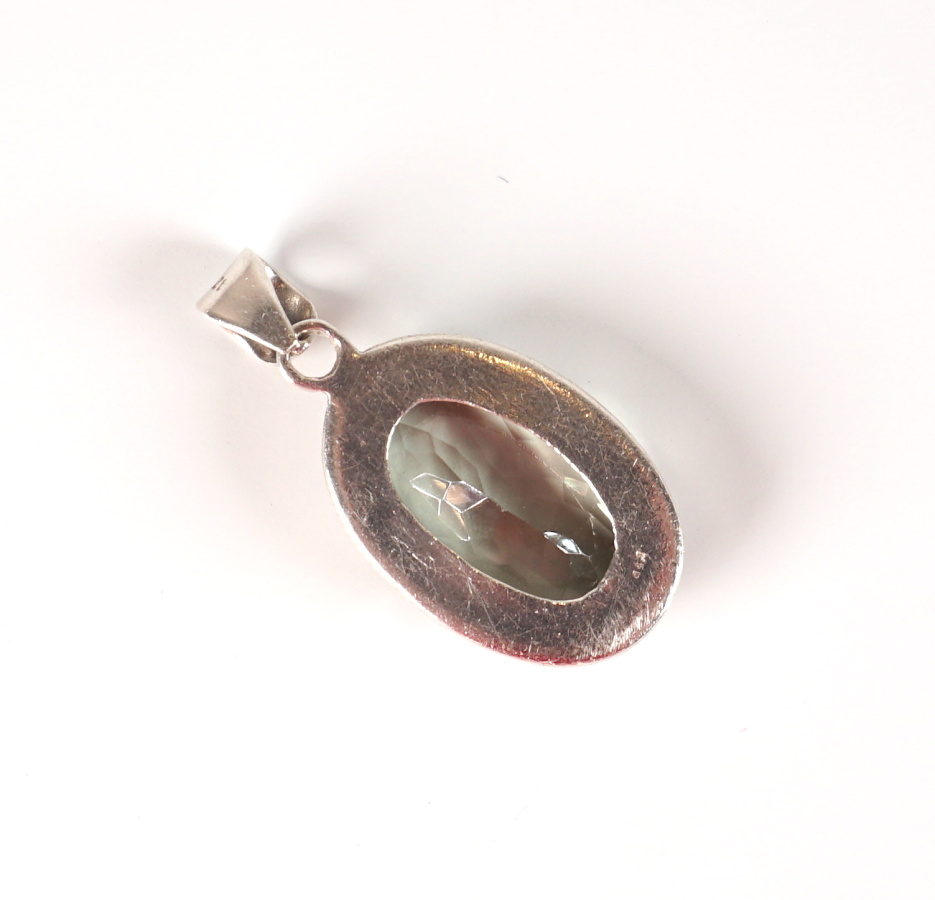 Pendentif ovale en argent (925/oo) orné d'une importante prasiolite (améthyste verte) facettée, H. 4 cm. Poids brut : 9.8 g environ.