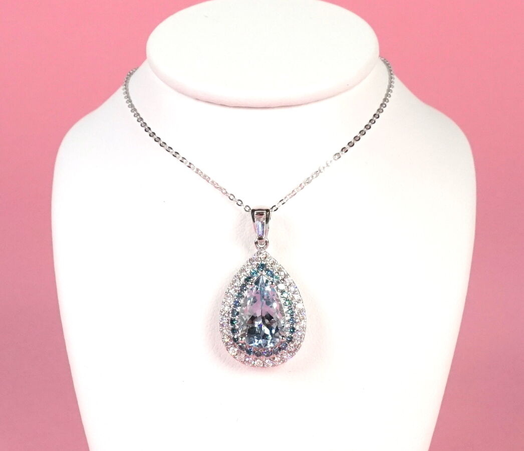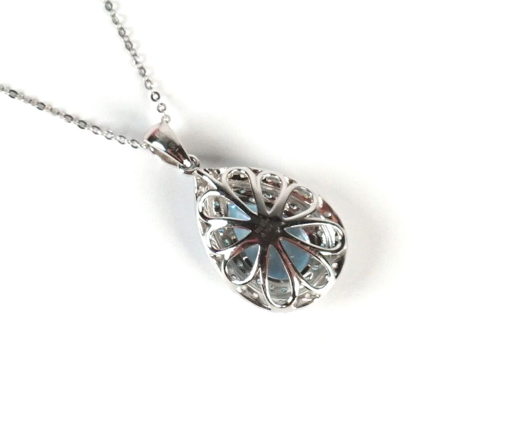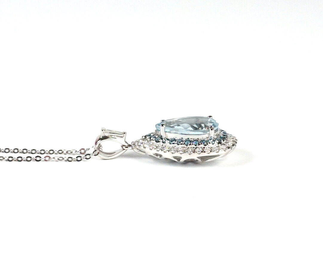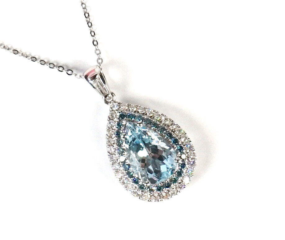 Pendentif "Poire" en blanc 18K (750/oo), serti en son centre d'une aigue-marine taille poire pesant 2.85 carats, dans un double entourage de 25 diamants bleus traités taille moderne et 31 diamants blancs taille moderne, la bélière agrémentée d'un diamant blanc taille baguette, l'ensemble des diamants pesant 0.65 carat environ, H. 2.5 cm.