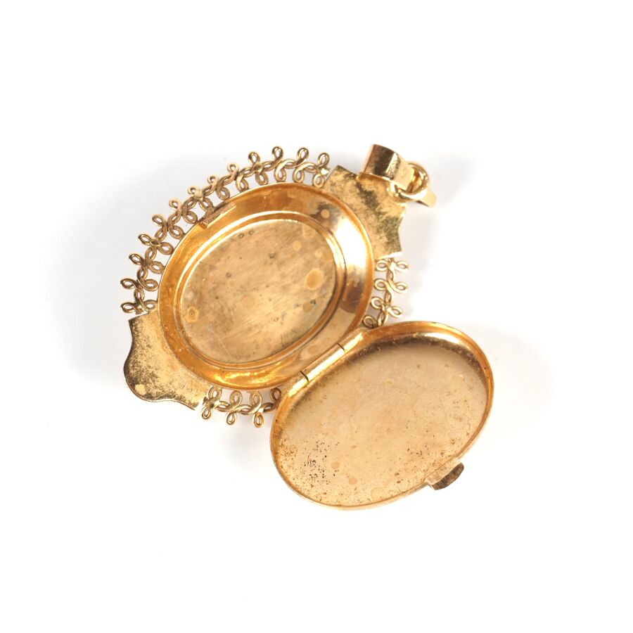 Pendentif porte-photo de forme ovale en or jaune 18K (750/oo), le centre gravé d'une étoile, l'alentour rayonnant à motif d'entrelacs, les extrémités rainurées, avec sa bélière (sans verre intérieur), H. Hors bélière : 4 cm. Poids brut : 5.9 g environ.