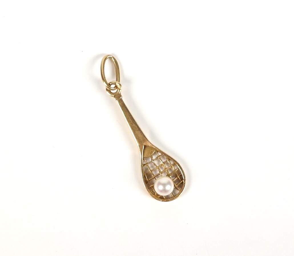 Pendentif "Raquette" en or jaune 18 K (750/oo) accueillant sur les cordes une petite perle de culture symbolisant la balle, L. 3 cm. Poids brut : 1.3 g environ.