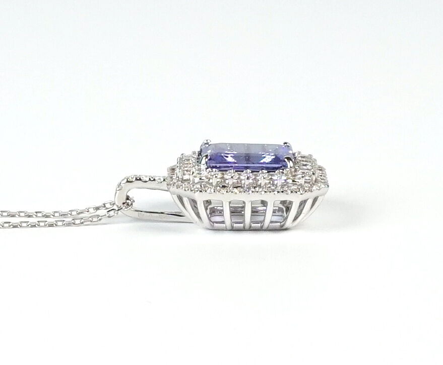 Pendentif rectangulaire à pans coupés et ajouré en or blanc 18K (750/oo), serti au centre d'une tanzanite taille émeraude pesant 2.65 carats, dans un double entourage de 68 diamants blancs taille moderne pour 0,60 carat au total, H. 2 cm.