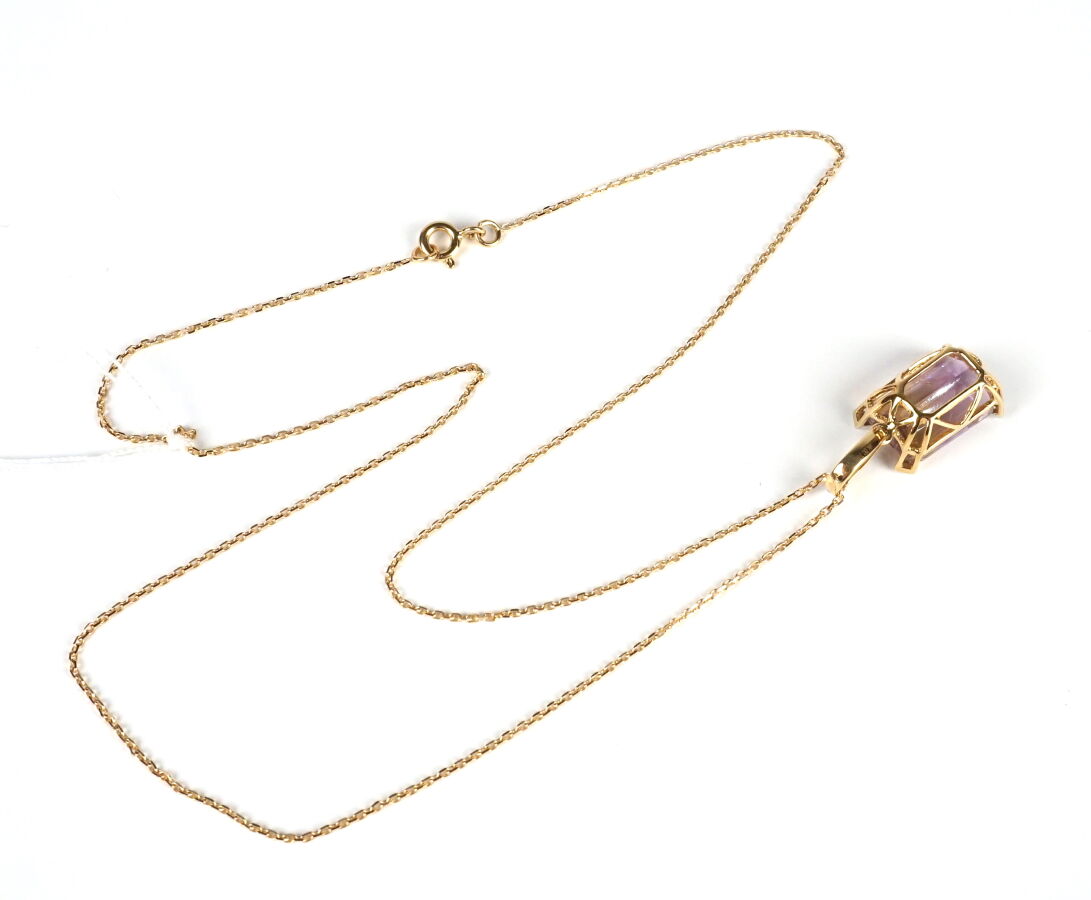 Pendentif rectangulaire en or jaune 18K (750/oo), serti d'une amétrine taille émeraude calibrant 6.10 cts, les 4 griffes et la bélière agrémentées de 13 diamants blancs taille moderne pour 0.10 carat, H. totale : 2.5 cm.