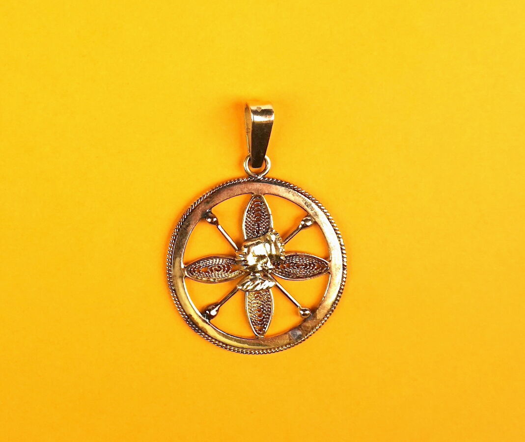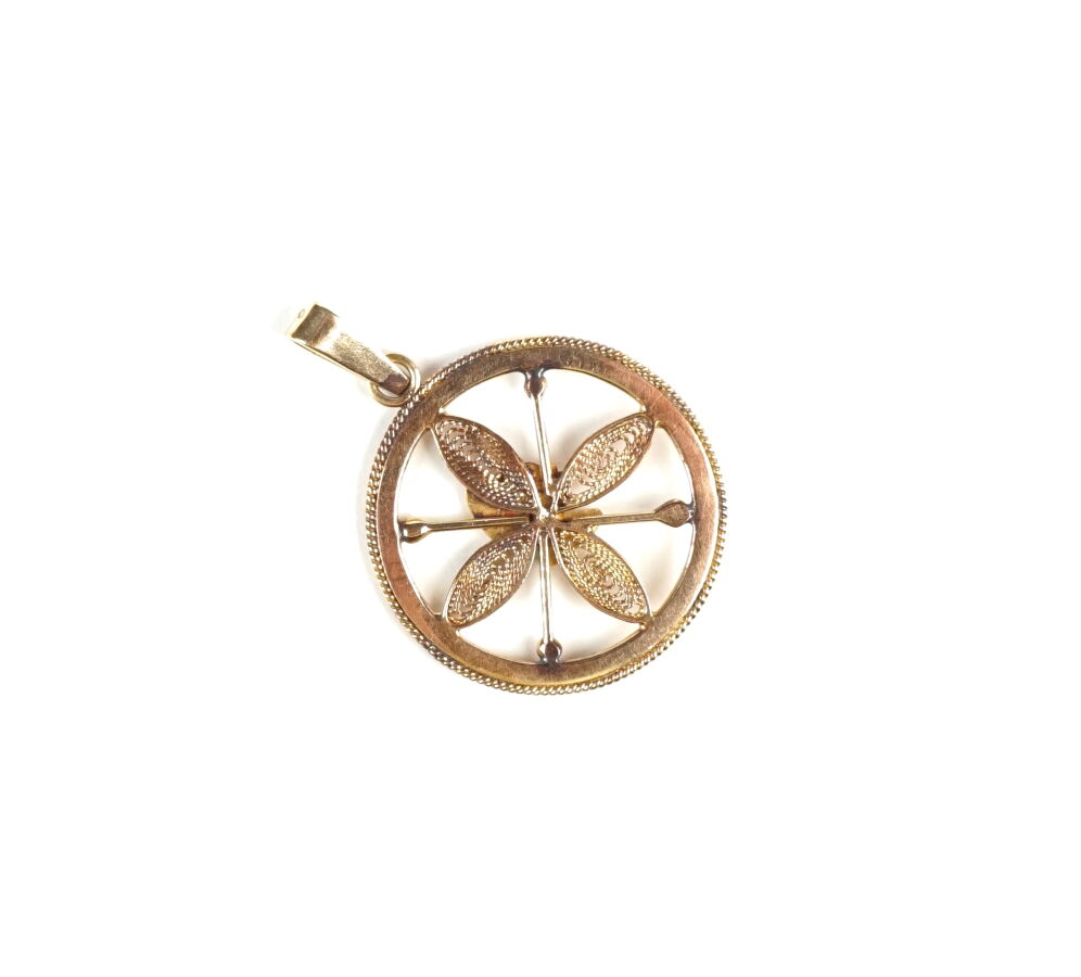 Pendentif rond en or jaune 18K (750/oo), formant un anneau accueillant au centre un motif de feuillages surmonté d'un portrait de femme africaine, D. 3.3 cm, H. 5 cm. Poids brut : 9.6 g environ.